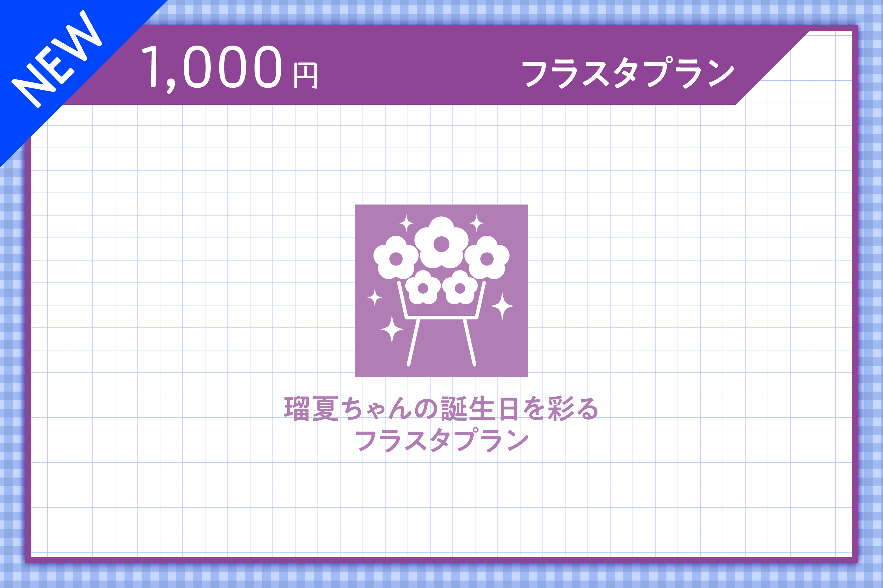 \フラスタプラン追加!/続いて新たに追加される「フラスタプラン」をご紹介いたします!一口1,000円から気軽にご参加いただけるプランで、一口=1本換算で計算させていただき、集まったご支援で瑠夏ちゃんの誕生日当日にフラワースタンドを贈らせていただきます!今回はフラスタの公募がないため、フラスタをご検討頂いていた方はこちらからぜひご支援ください!みんなで力を合わせて、最高のフラスタを届けましょう!