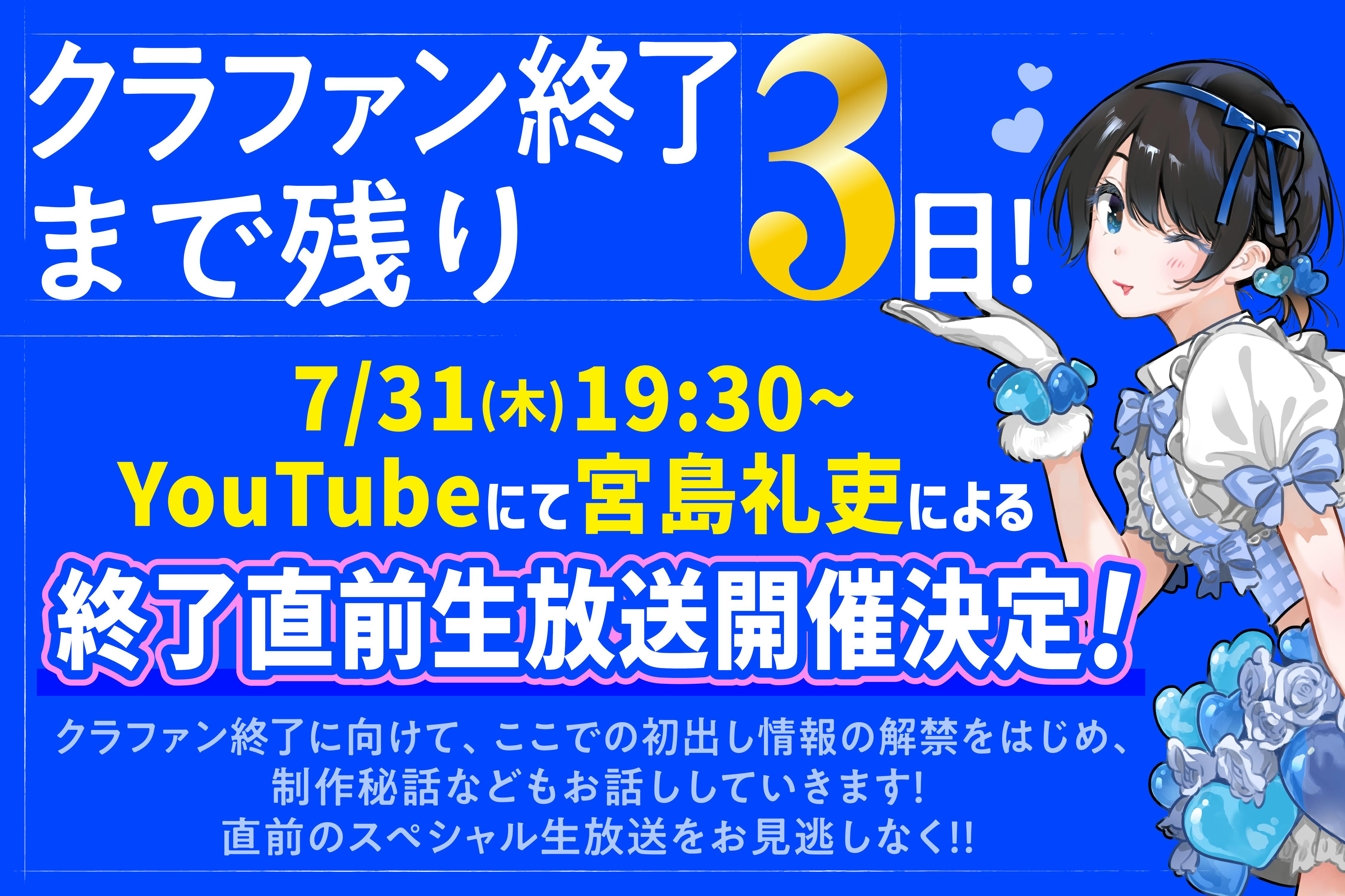 皆様、いつも応援いただきありがとうございます!7月31日のクラファン終了まで残りわずかとなりましたが、新情報をお持ちしました!この度、7/31(木) 19:30~ YouTubeにてクラファン終了直前生放送の開催が決定しました!宮島先生によるトークはもちろん、新情報の解禁やさまざまな企画等、盛りだくさんでお届けしますので、ぜひ楽しみにお待ちください!直前にXにてスペースでの生放送も行いますので、そちらも併せてお楽しみに!※時間の多少の前後は想定されます。あらかじめご了承ください。