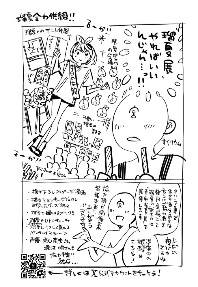 内容:今回の描き下ろし単行本での瑠夏と和也のデートを再現した、体験型の展示となっております。二人がデートに行ったゲームセンターがベースの空間となっており、クレーンゲームやプリクラ等のコンテンツをご用意しております。基本的に予約でのご案内を想定しており、支援いただいた方以外もご入場いただけます。満足度2以上のコースをご支援いただいた方は先行来場予約をいただけますので、ぜひご活用ください。
