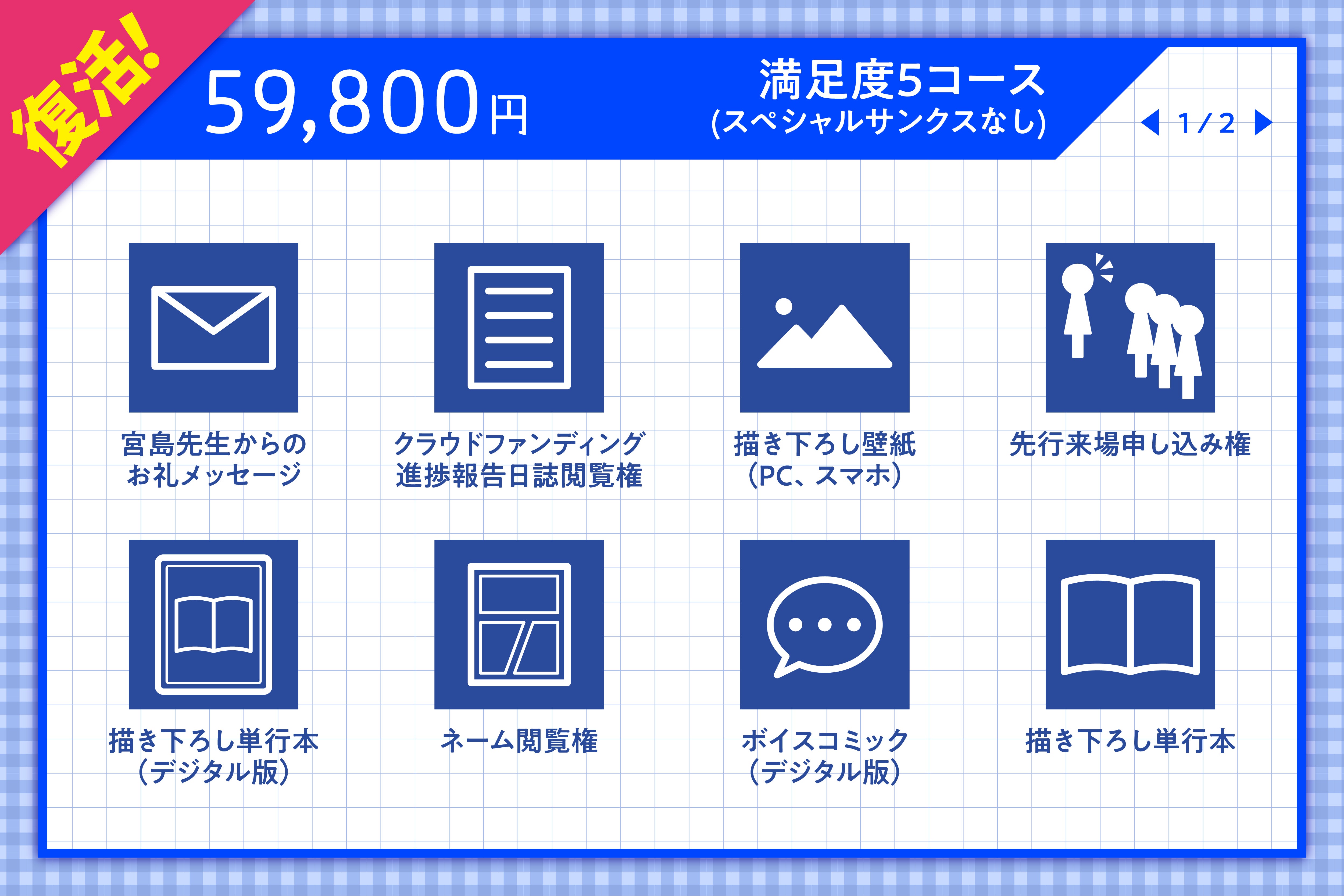 なお、復活した満足度5コースですが、掲載枠の関係上、今回の募集ではスペシャルサンクスの掲載は無しでのご案内となりますことを予めご了承ください。