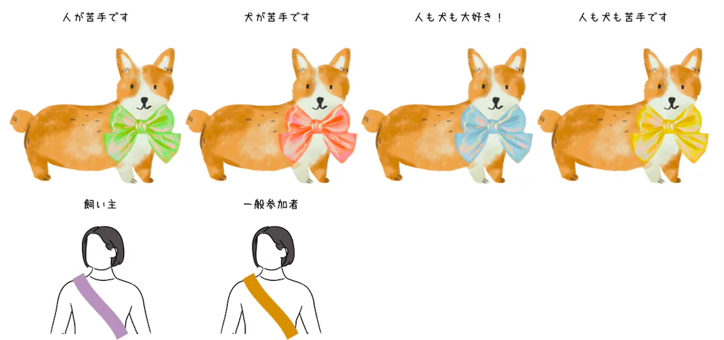 イベントでは参加者とワンコたちに目印となるリボンやたすきをつけていただきます。