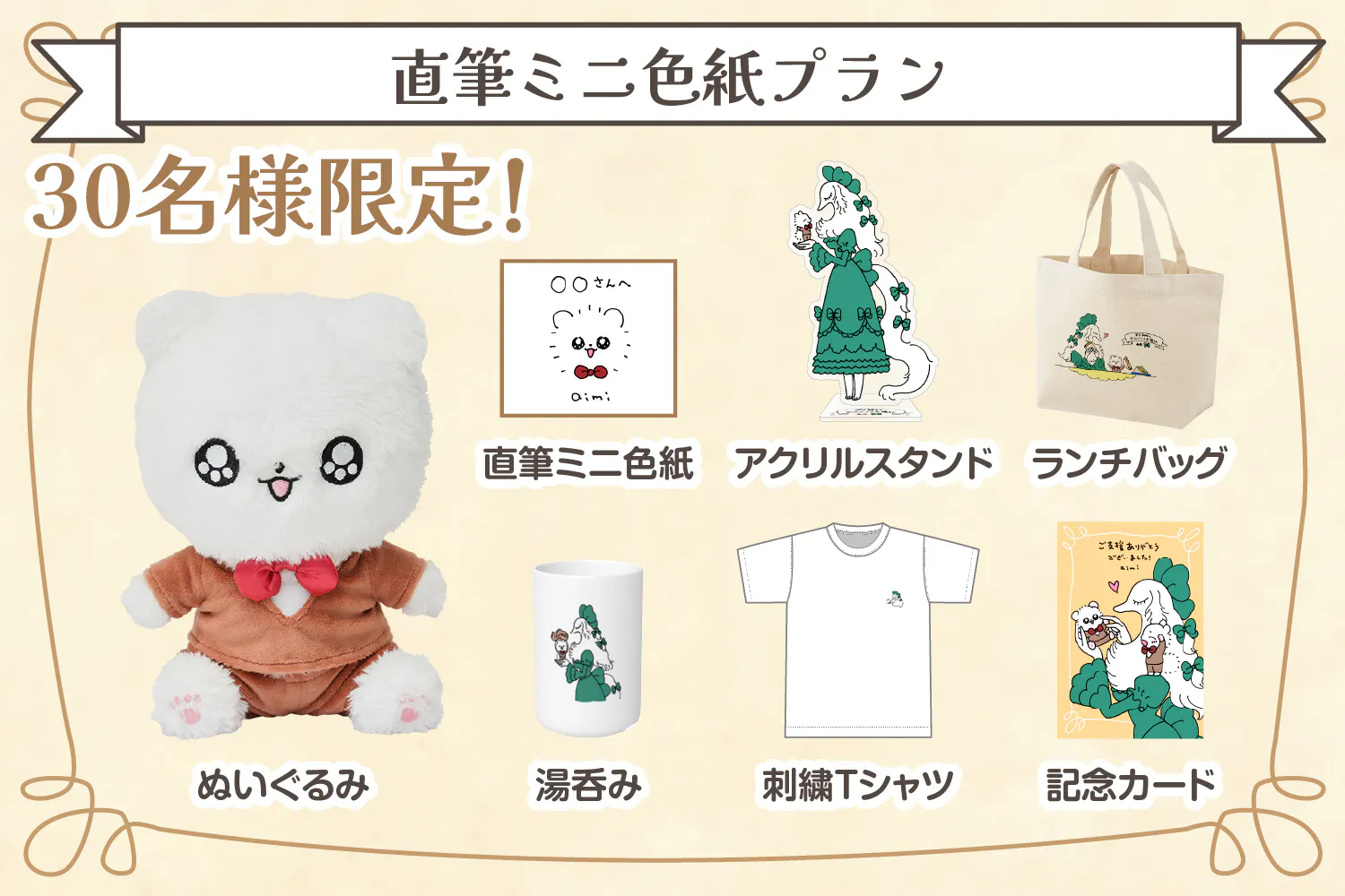 【30名様限定!】直筆ミニ色紙プランでの直筆ミニ色紙とはどのようなお品物となるのでしょうか。宛名とともに色紙に描いていただけるイラストはリクエスト(例:ポメ紳士さん+支援者の方の好きなお花など)可能でしょうか。