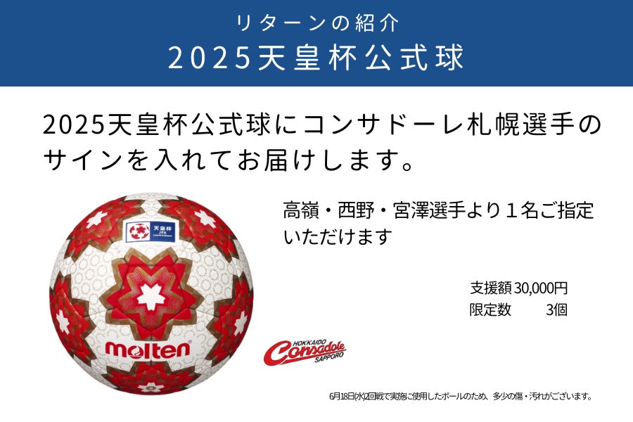 コンサドーレ札幌選手のサイン入りボール、エスポラーダ北海道のホームゲーム招待券、高校選手権決勝戦の招待券、そして明治の本格カレーなど、楽しんでいただけるラインナップです。