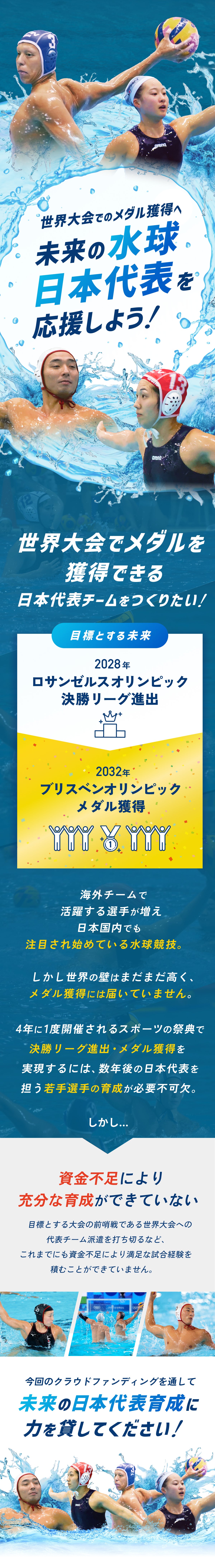 まだまだ日本ではマイナー競技である水球ですが、選手たちは日々スキルを磨きながら日本代表として大きな目標を胸に世界の舞台で戦っています。試合をメディアなどを通して見ていただく機会は少ないものの、ぜひこのクラウドファンデイングをきっかけに皆様が水球競技にも注目していただけると幸いです。