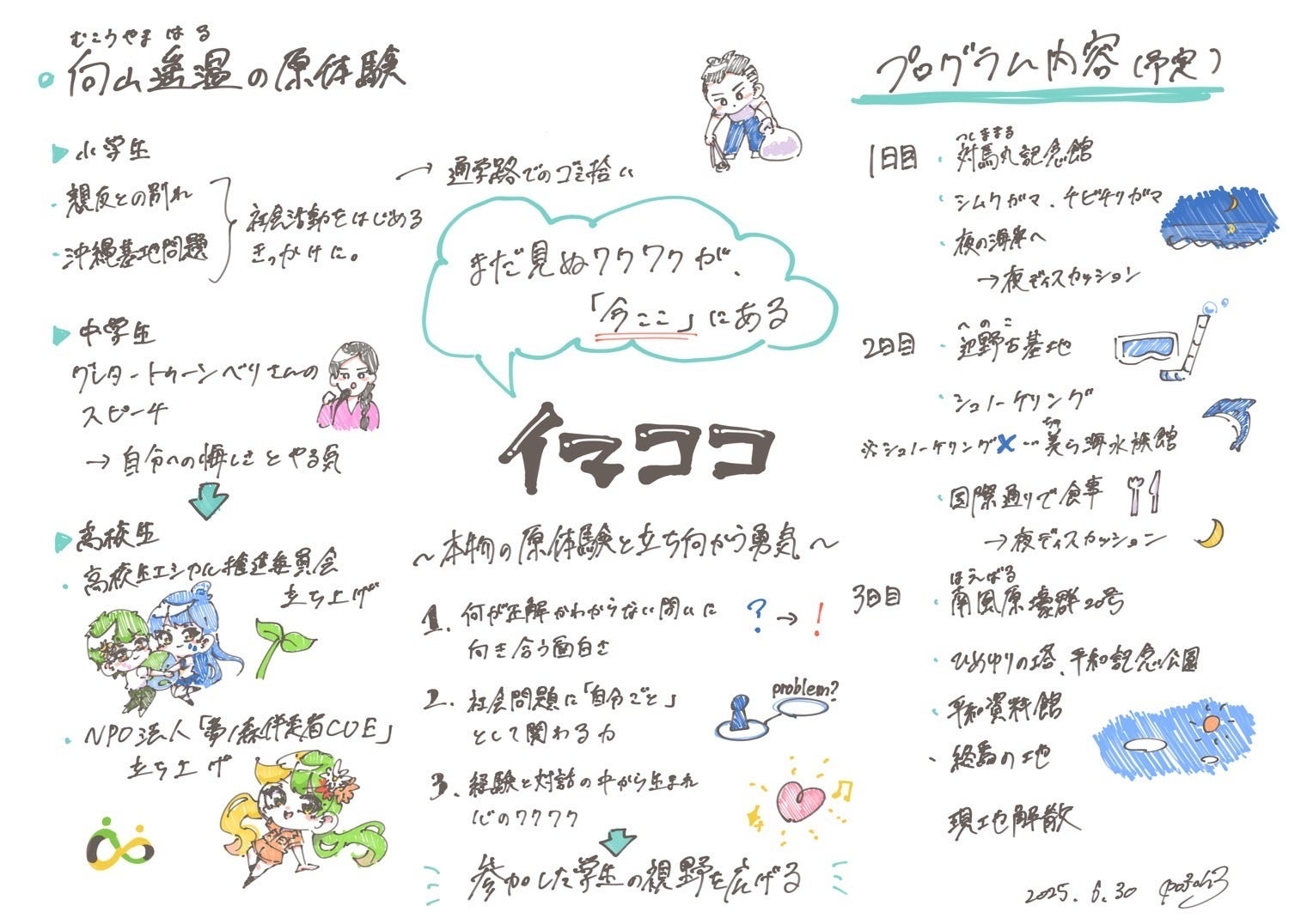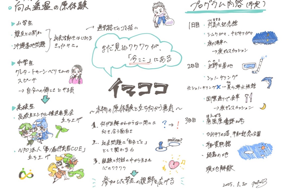 2025/11/13 19:00「イマココ - 沖縄原体験フィールドワーク」いよいよ参加者募集スタートです!海の青さ、風の音、戦跡で出会う“生きる”という言葉の重み。「自分はどう生きたいのか?」その問いを、仲間と一緒に探す3日間です。いよいよ、参加者募集をスタートします!現地の方との対話、自然との向き合い、そして“心が動く瞬間”。きっと、あなたの中の何かが変わります。開催日:2026年3月で参加希望者と調整開催地:沖縄本島対象:高校生〜大学生(定員5名程度)参加費:15,000円(宿泊費とレンタカー代、施設利用費が含まれており、現地までの航空機代と食事、お土産代は各自負担となります。)主催:NPO法人 夢ノ森伴走者CUEよろしくお願いします!! もっと見る