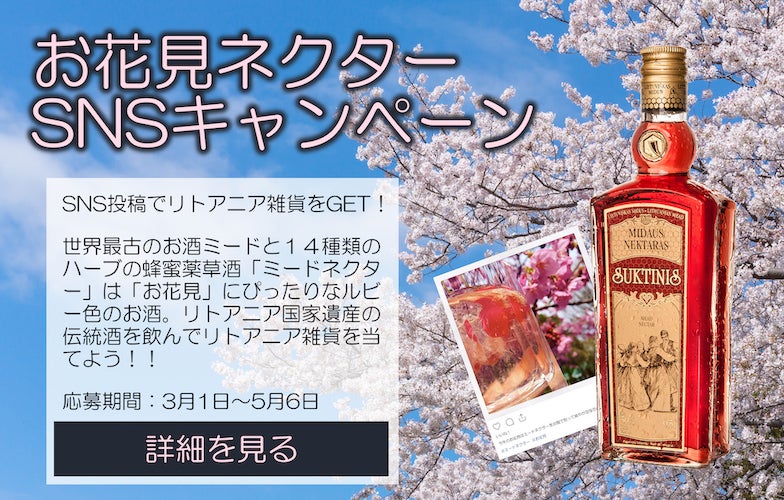 いくつかのリターンにもラインナップされている「ミードネクター」はルビー色で炭酸やお湯で割るとキレイな桜色が楽しめるリキュールです。お花見の時期にぴったりなこの「ミードネクター」と「お花見」のハッシュタグでSNS投稿をして頂いた方の中から3名の方に現地で購入したリトアニア雑貨をプレゼントさせて頂きます。