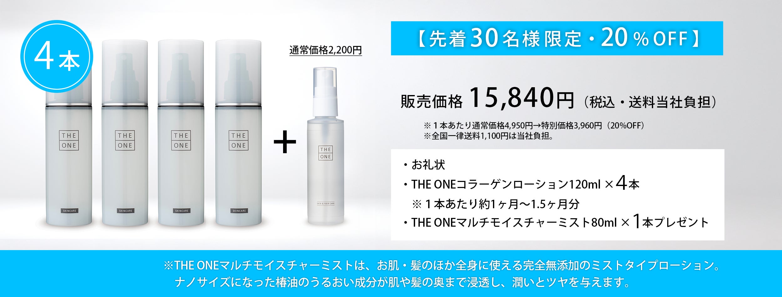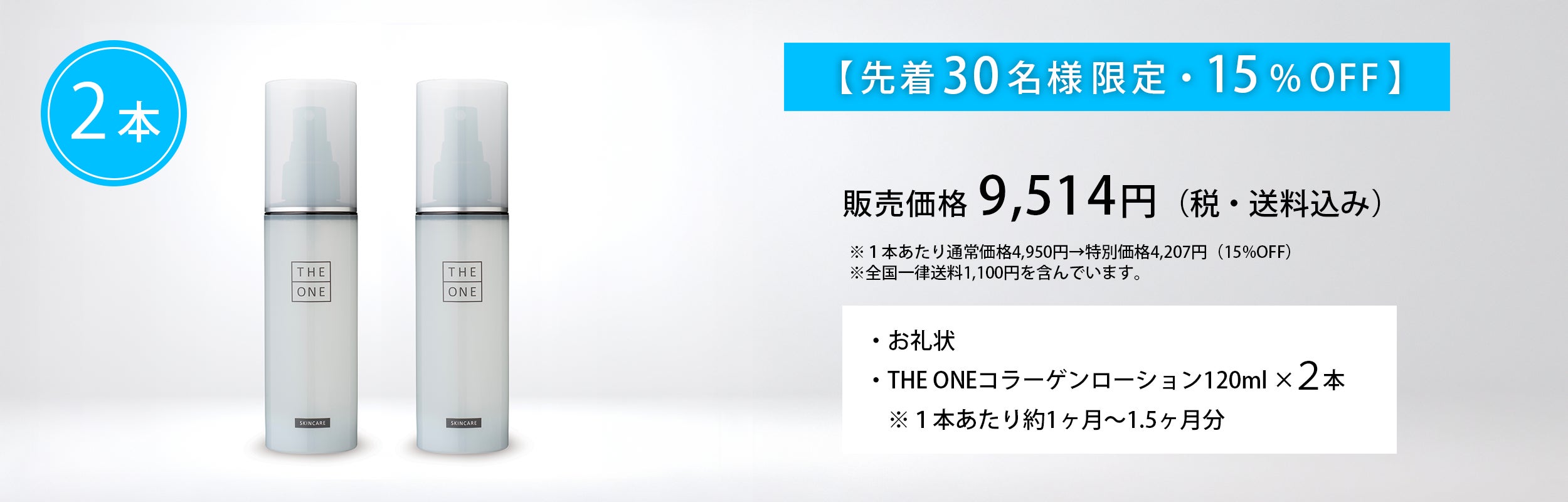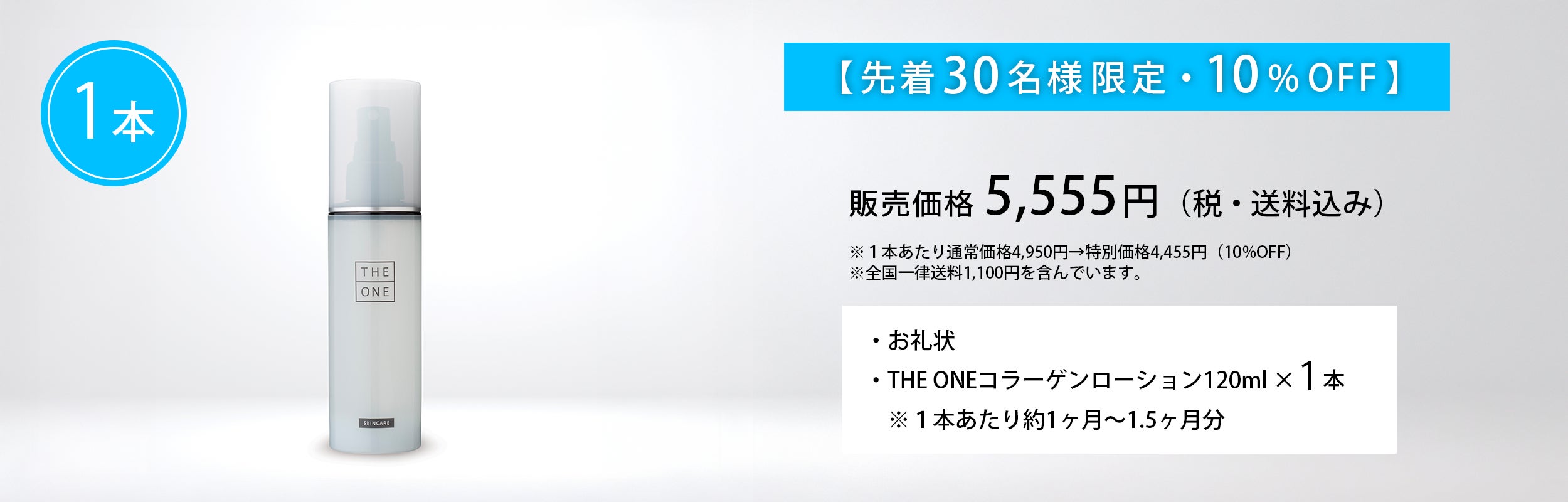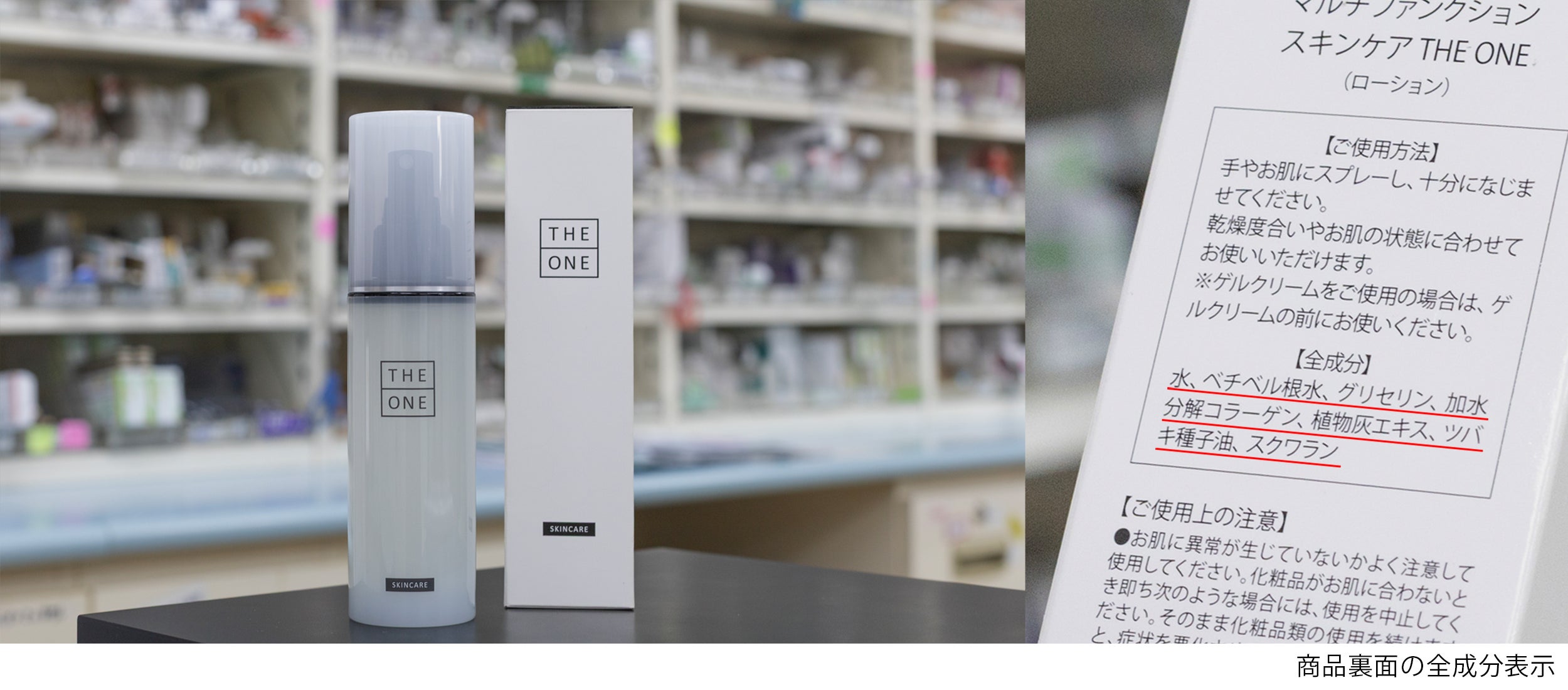 配合する成分をひとつひとつ厳しく精査し、ようやく自信をもってお勧めできる商品「THE ONE コラーゲンローション」が完成しました。保存料や界面活性剤はもちろん、添加物と言われる一切の原料は使用していません。本当に肌が必要としている成分だけを調合したスキンケア商品です。