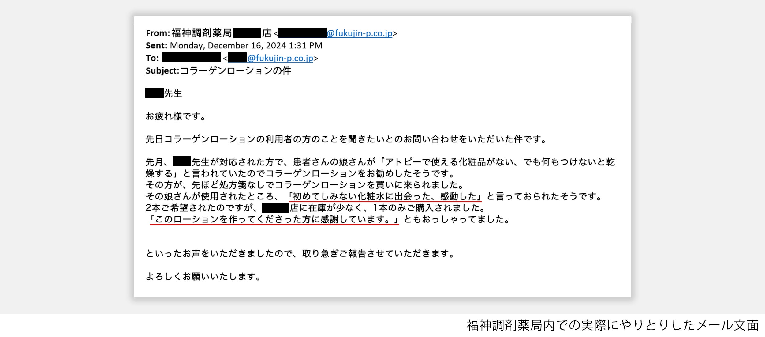 その方はアトピーのために、使える化粧品が無く肌の乾燥でお困りだった患者さんでした。THE ONE コラーゲンローションを使ってみたところ、トラブルもなく使い切れたようで『初めて沁みない化粧水に出会った、感動した。このローションを作ってくださった方に感謝しています。』とおっしゃられていました。わたしたちがやってきたことが間違っていなかったと、報われた瞬間でありました。