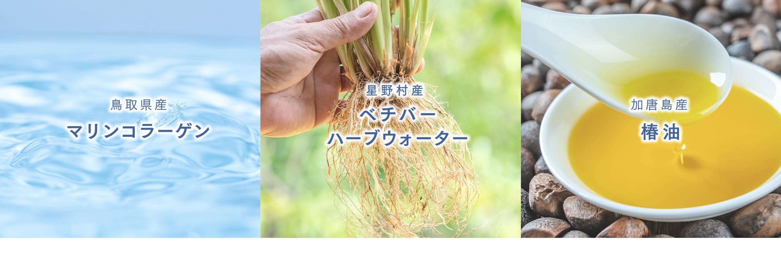 さらに高い保湿力をもつ「椿油」は、加唐島産(佐賀県)。熱を加えていない生搾りのものを使用、通常よりも2.5倍もの保湿力があります。肌トラブルに対して鎮静作用が期待できる「星野村産(福岡県)ベチバーハーブウォーター」。