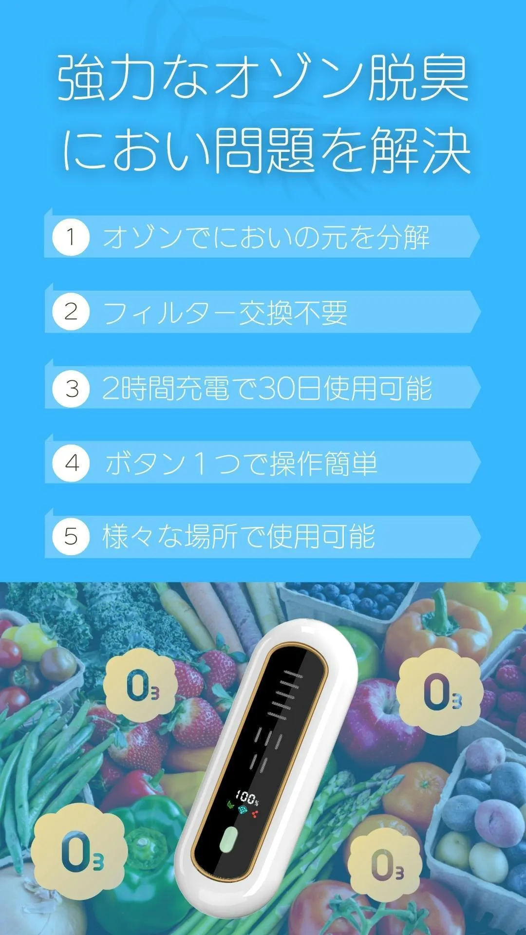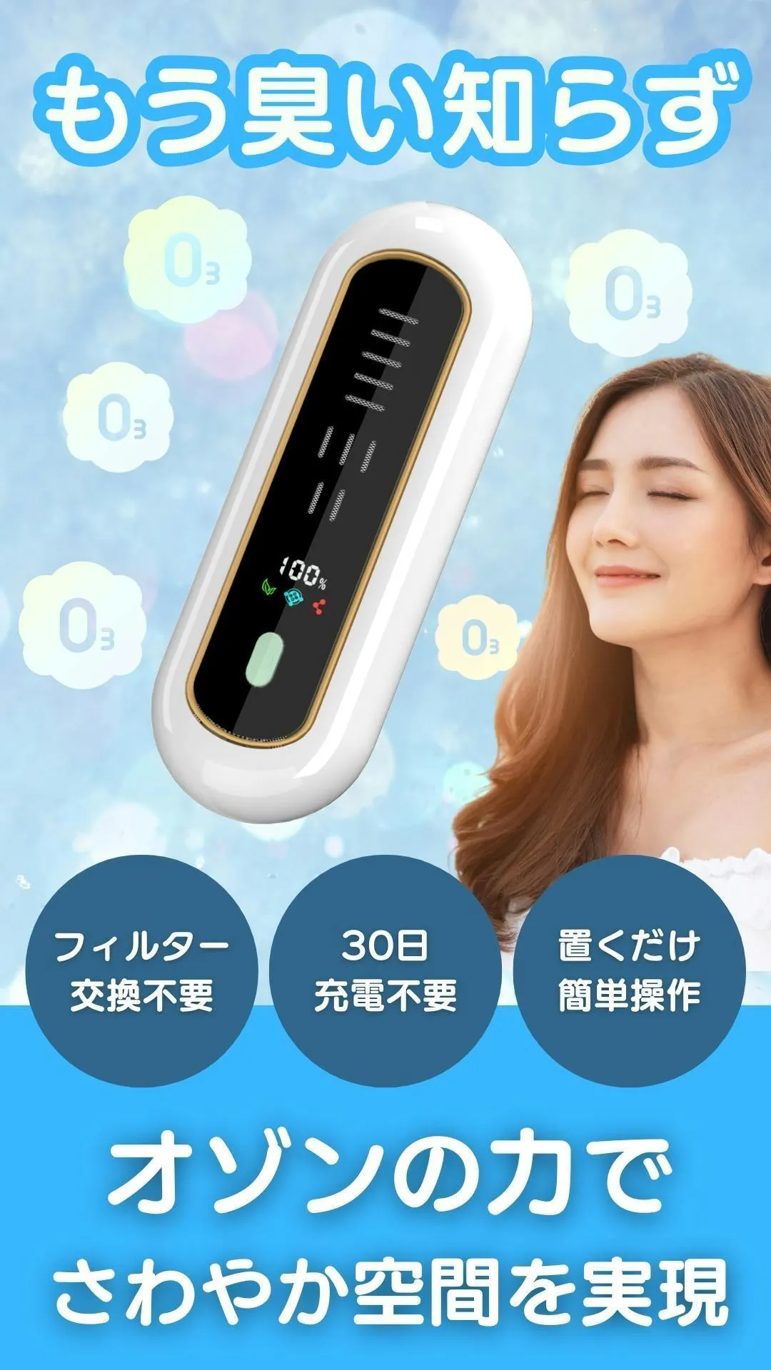 そこで、強力なオゾンの力を活用し、手軽に使えてメンテナンスがほとんど不要な脱臭機を開発することにしました。オゾン脱臭機なら、フィルター交換なしで長期間使用できるため、ユーザーの手間を大幅に減らすことができます。また、充電式でどこにでも置けるコンパクトなデザインにすることで、あらゆる空間で快適に利用できるようにしました。