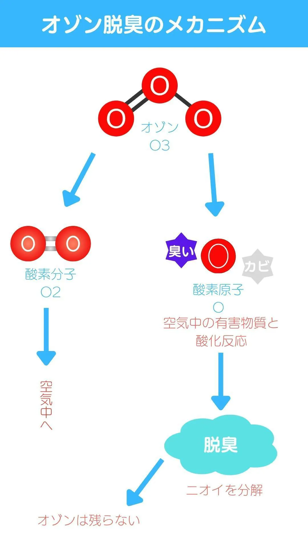 残りの2つの酸素原子は酸素(O₂)になるので、脱臭が行われた後には酸素だけが残ります。そのため、オゾンを使った脱臭は安全性が高いと言われています。