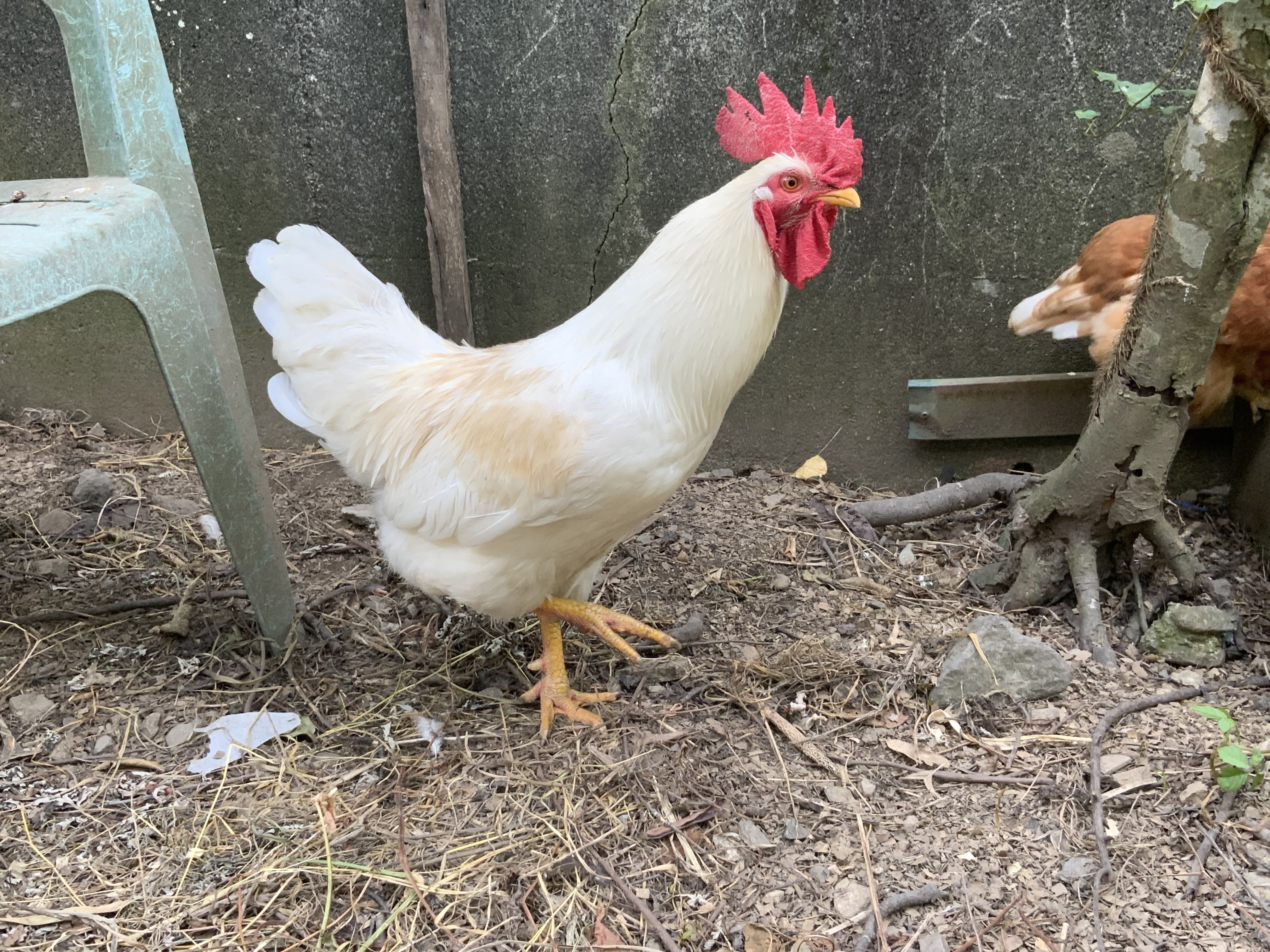 2025/07/07 12:16オス鶏番号 5オス鶏、現在は9羽おりますその中で唯一の真っ白い鶏この子達はお母さんが自分で温めて子育てした子です生後8ヵ月でこの貫禄比内鶏は小さいクルミ冠と呼ばれるトサカなのですがこの子は立派なトサカ比内鶏DNA少なめなんでしょう、尾も短いメスの大きなトサカは横に倒れたりするのですがオスのトサカは強いんですね もっと見る