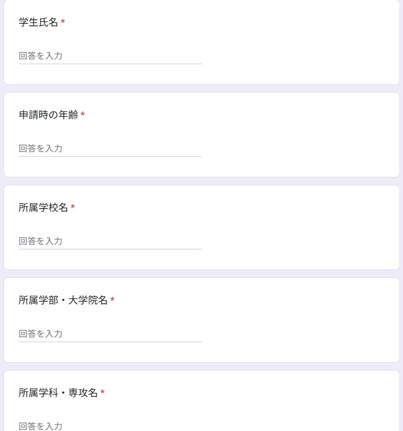 交通費申請フォームの記入項目は、学生氏名、年齢、所属情報(学校名、学部学科名、学年など)、メールアドレスと連絡先電話番号、学生証など学生身分を証明する信憑書類の控え、活動に参加した団体もしくは事業者名、活動日程(開始日と終了日)、航空券領収書、公開して良い活動風景写真(任意)、感想などです。