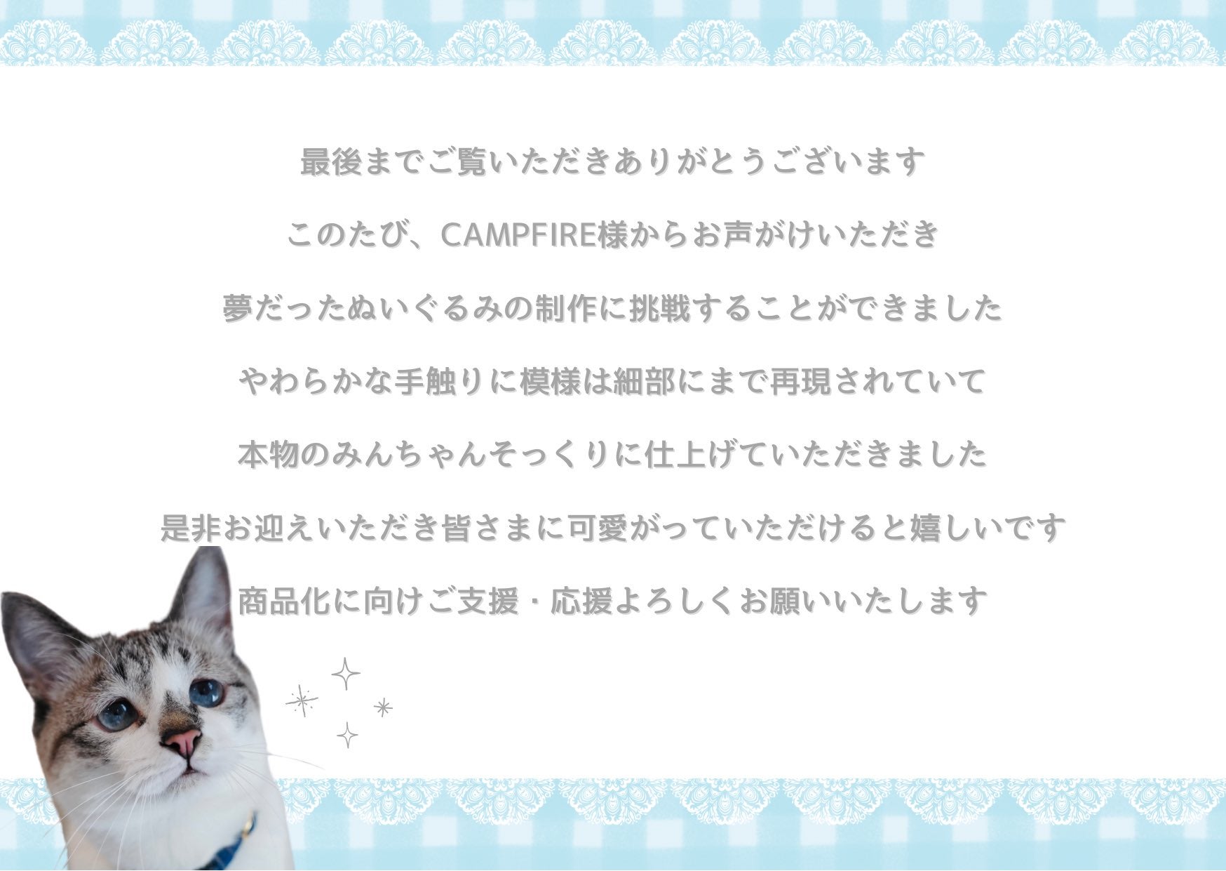 2025/06/18 17:00Creationスタッフです。しょんぼり困り顔なぴえん猫!ミントぬいぐるみ化プロジェクト!へのご支援ありがとうございます!この度、目標金額達成を記念しまして...【ストレッチゴールを設定しました!】130%達成で支援者様「全員」にミントちゃんのステッカーをプレゼント!見る角度により、表面が虹色に光って見えるホログラム素材のステッカーです!クラファン限定ですのでぜひゲットしてくださいね♪クラファン期間は6月29日 23:59までです!!引き続き応援よろしくお願いします♪ もっと見る