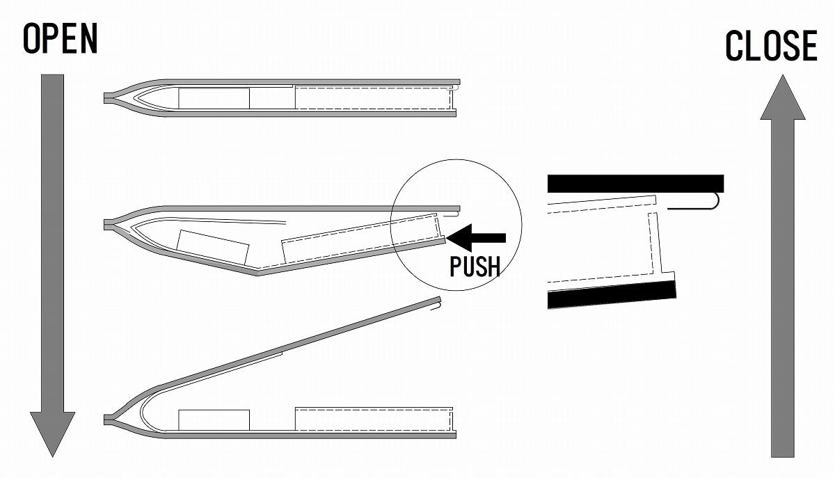 僅か数ミリたわませるだけで開き、同じ動作で閉めもできる。片手だけでも操作可能。