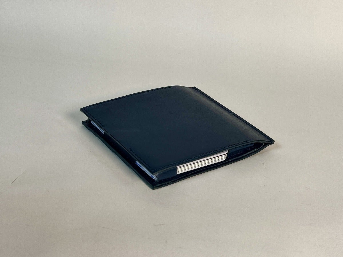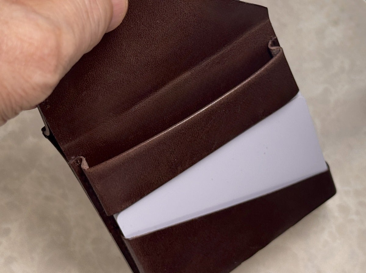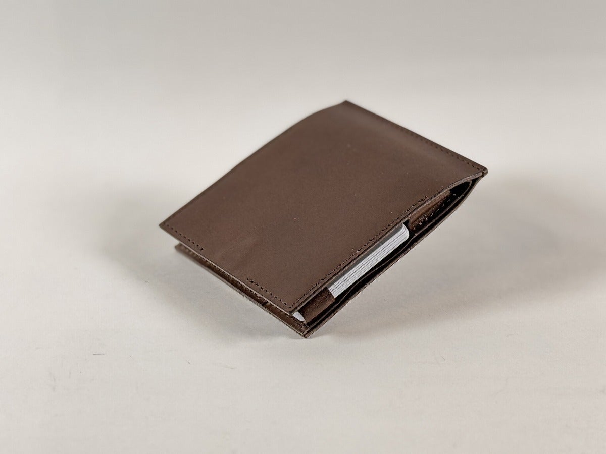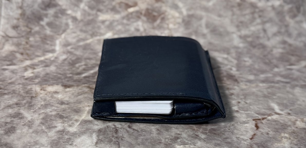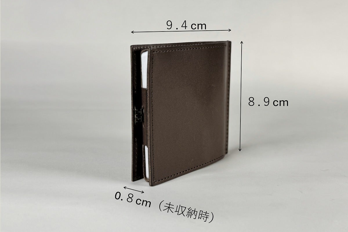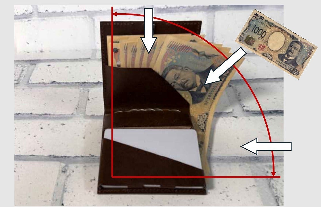 縦横最小なら三つ折り財布が有利。しかし厚さと自動支払い機でお札がエラーになるリスクに配慮して、「最速で最薄」の形態を求めて研究しました。