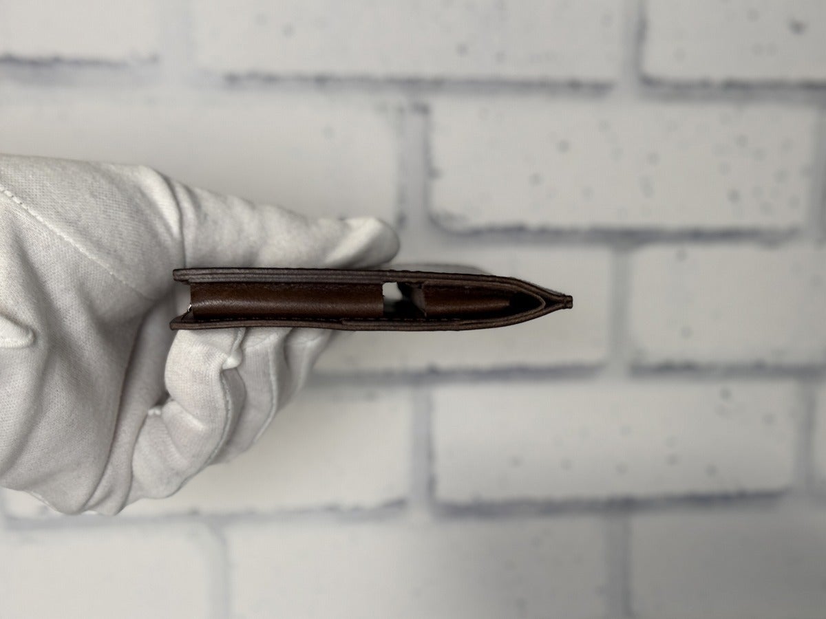 閉じたとき前カンは受けスリットに収まるだけ。革への負担は最小限です。