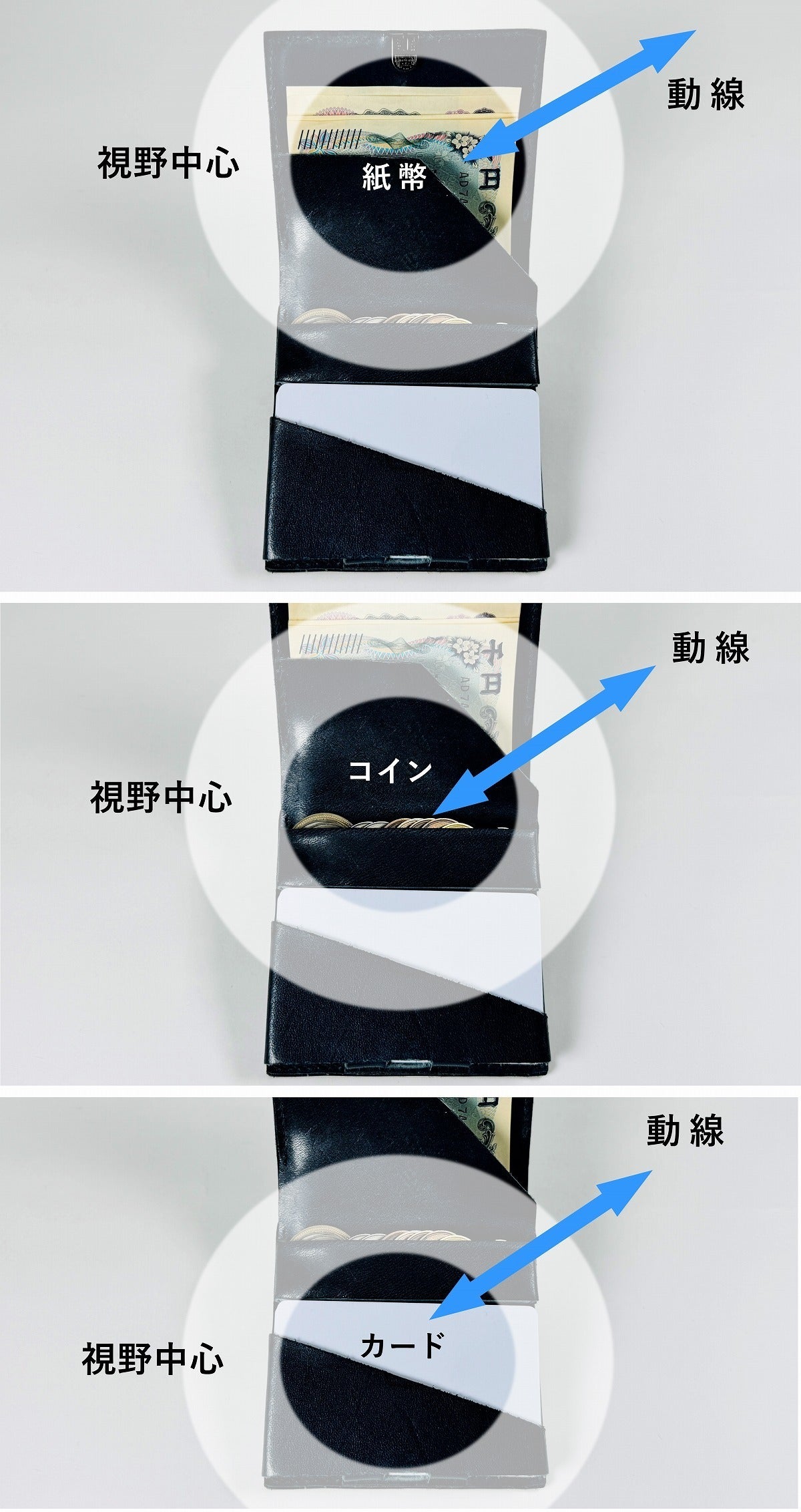 また、オープンな長財布にはごちゃつき感がありました。人の視野は横長のため、長財布の作業視野には対象以外の情報が入りこみ、思わず気がとられがちです。