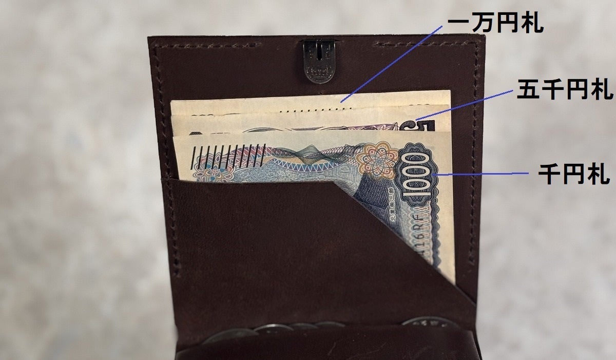 財布を閉じると、コインポケットの厚さで紙幣に折り目が付きません。