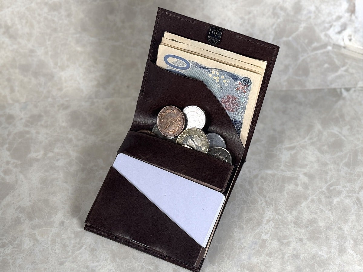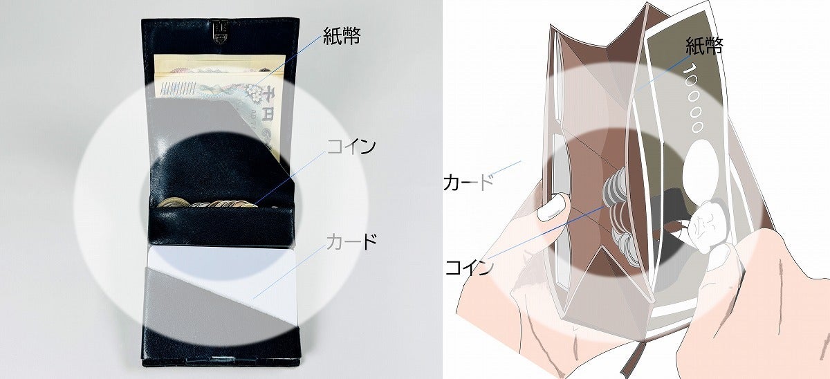 また、機能とデザインを失わないギリギリの「限界収納量」は紙幣25枚・硬貨22枚・カード12枚。
