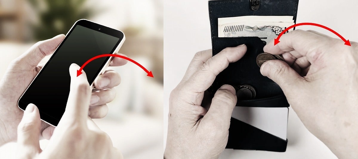 スマートフォンは持ち替えることなくもう片方の手首から先を円弧状に動かして操作しますが、その動きは人間が最も動かしやすい動作の一つ。ミニ財布ならばそれが簡単です。