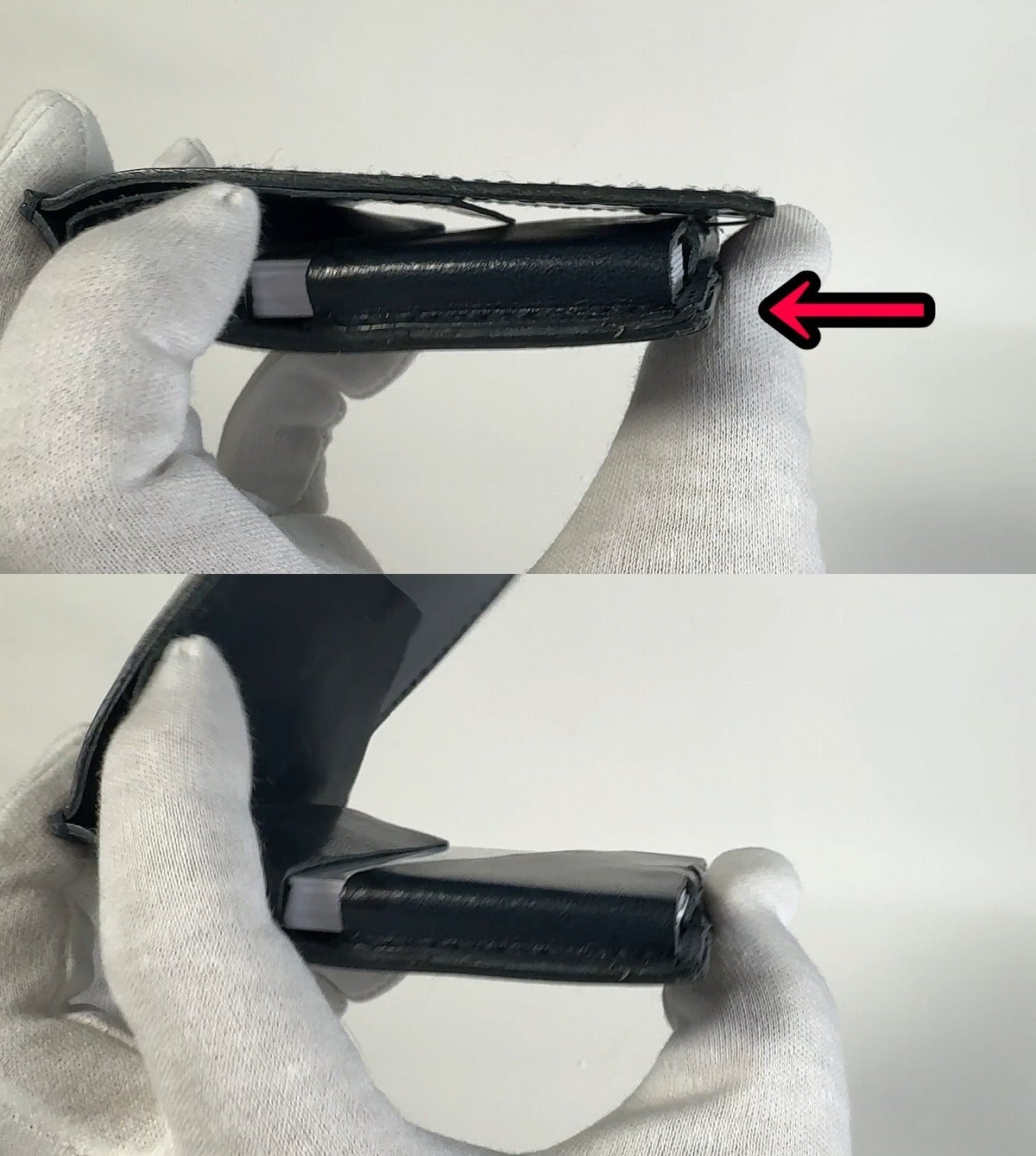 ◆財布の一部を本体に引っ掛ける構造は引っ掛けが難しかったり著しい本体変形を伴うリスク