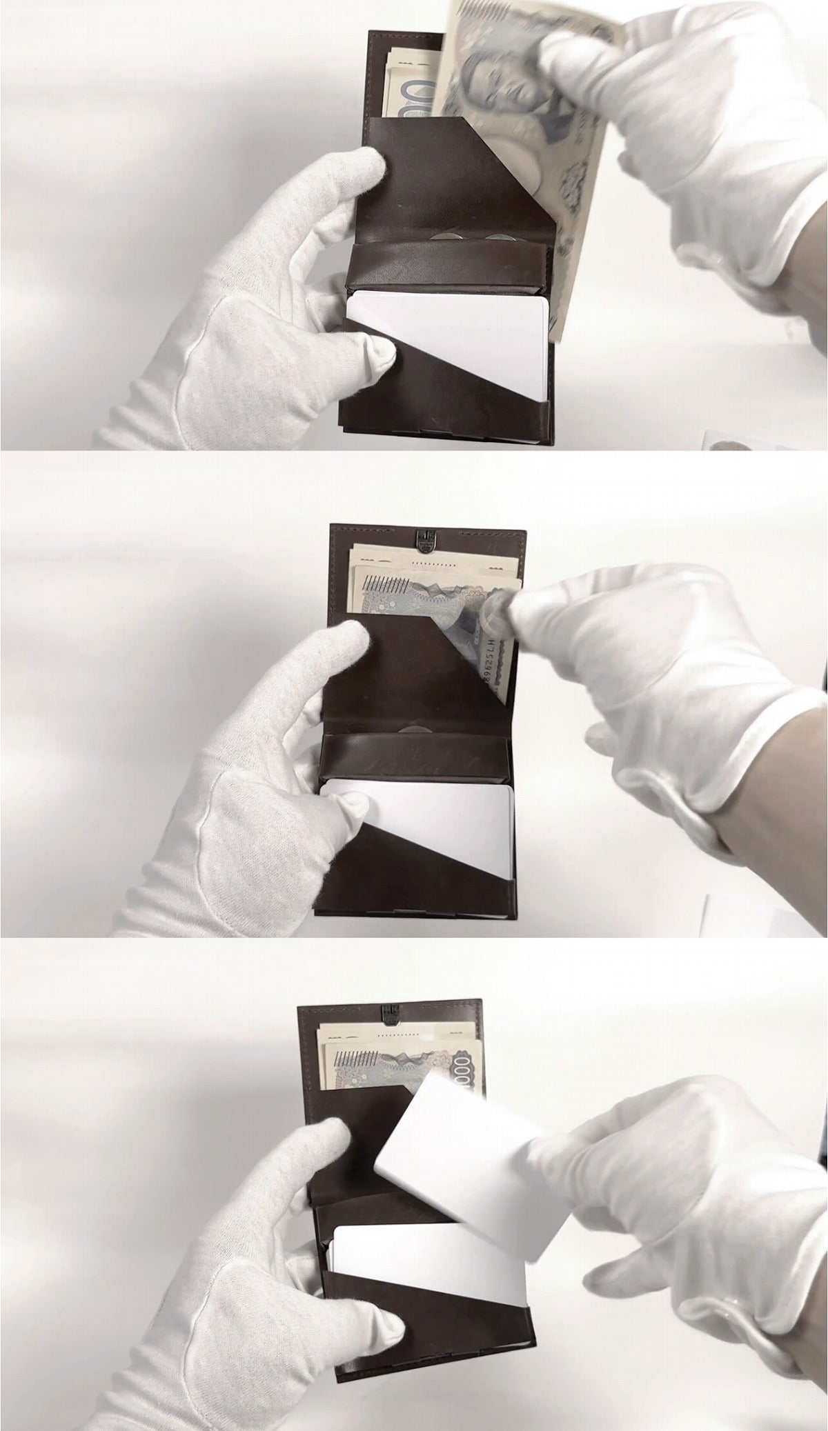 まず、支払い作業を最少限に凝縮し、最も単純な作業モデルを作りました。そのモデルに合わせて財布を構成すると、実は「オープンタイプの長財布」が理想に近いと分かりました。