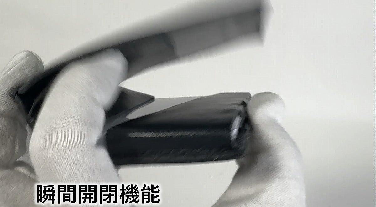 シンプルアクションで、一瞬で開閉。(特許)指で数ミリ押すだけの瞬間ロックと瞬間解除。見なくても片手でもできる初めての快感開閉です。