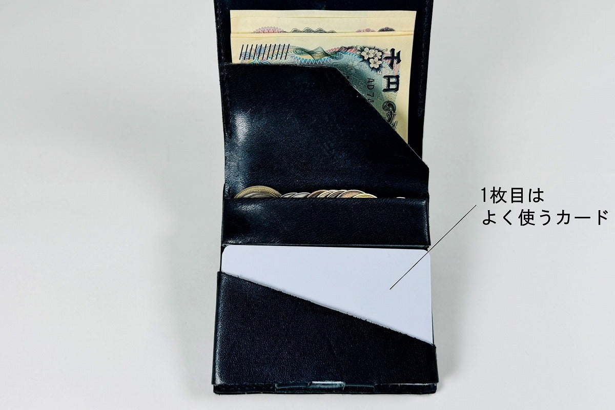 一枚目のカードはポケット正面の斜めカットで識別できます。使用頻度の高いカードはここに。