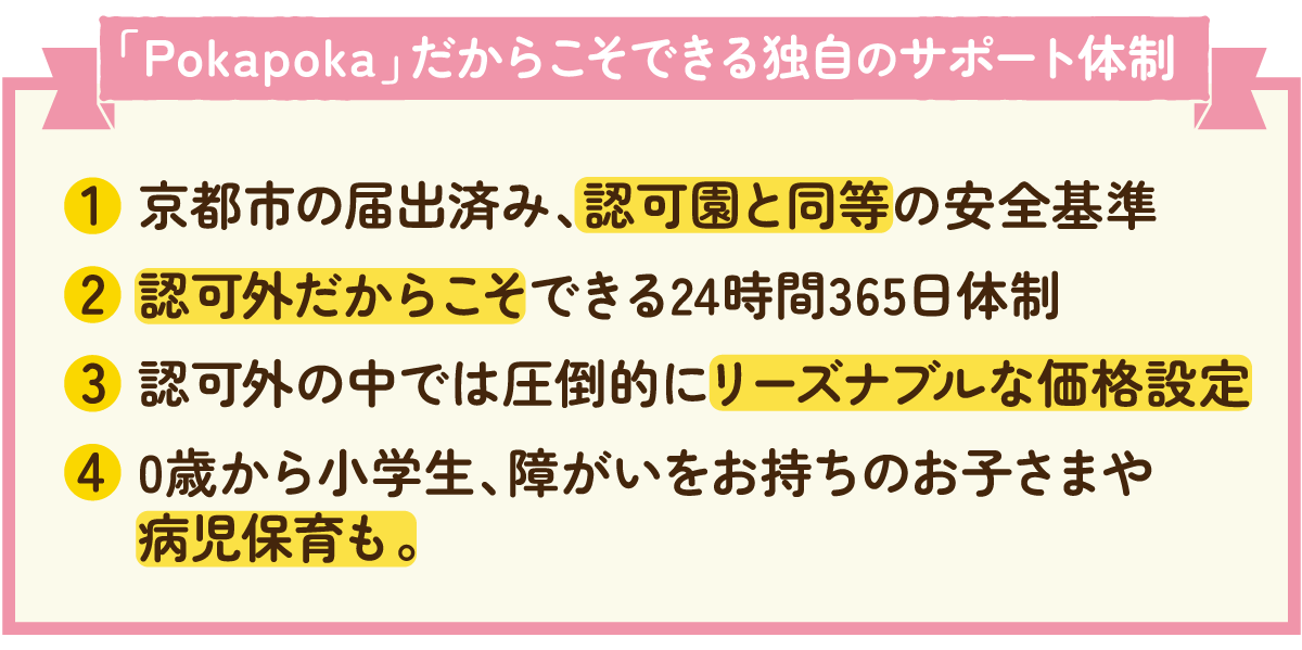 Pokapokaが24時間365日保育ができるのも、認可外園だからこそ。