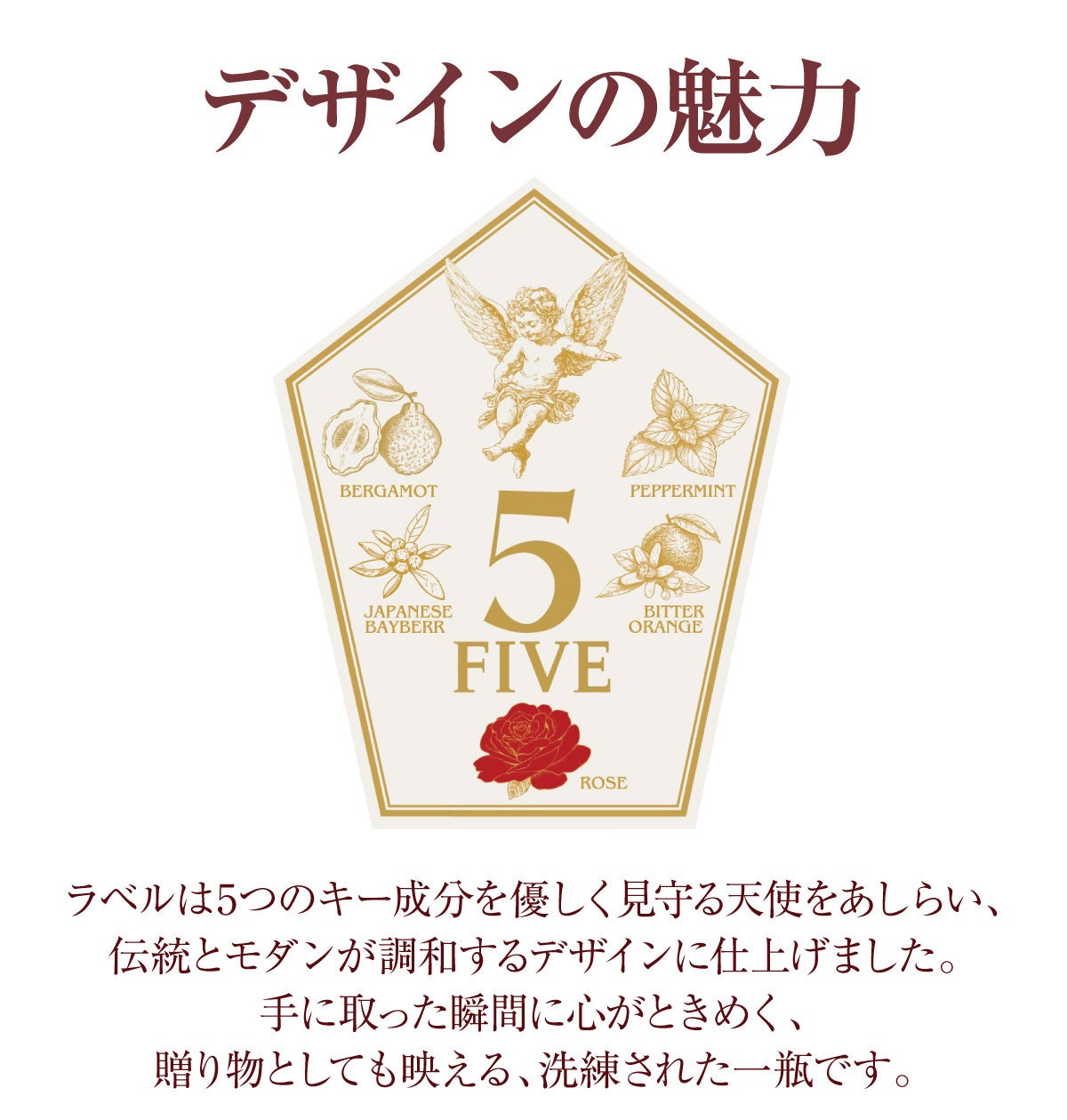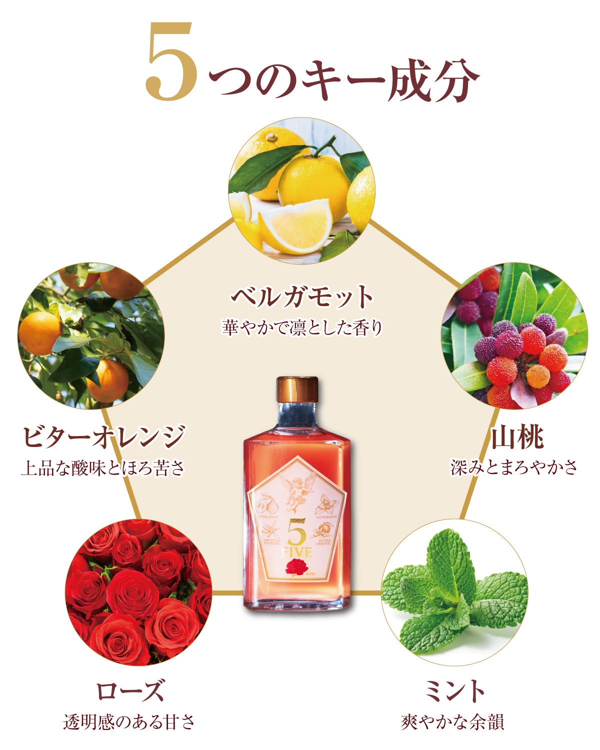 自然の恵みをそのまま閉じ込めた5つの素材が、重なり合い、奥行きある味わいと美しい余韻を生み出します。