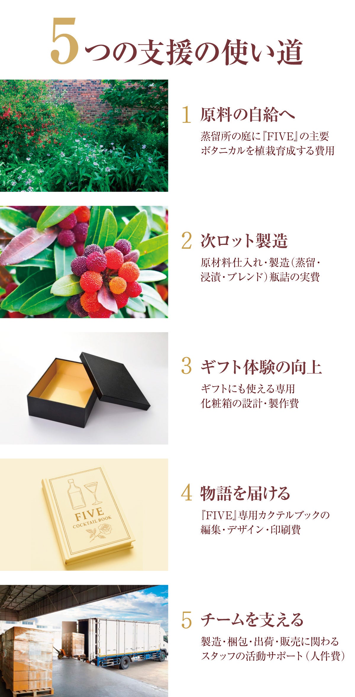 国産素材にこだわった新作リキュール『FIVE』のクラウドファンディング。限定価格のセットやギフト仕様もご用意しました。温かいご支援をどうぞよろしくお願いいたします。
