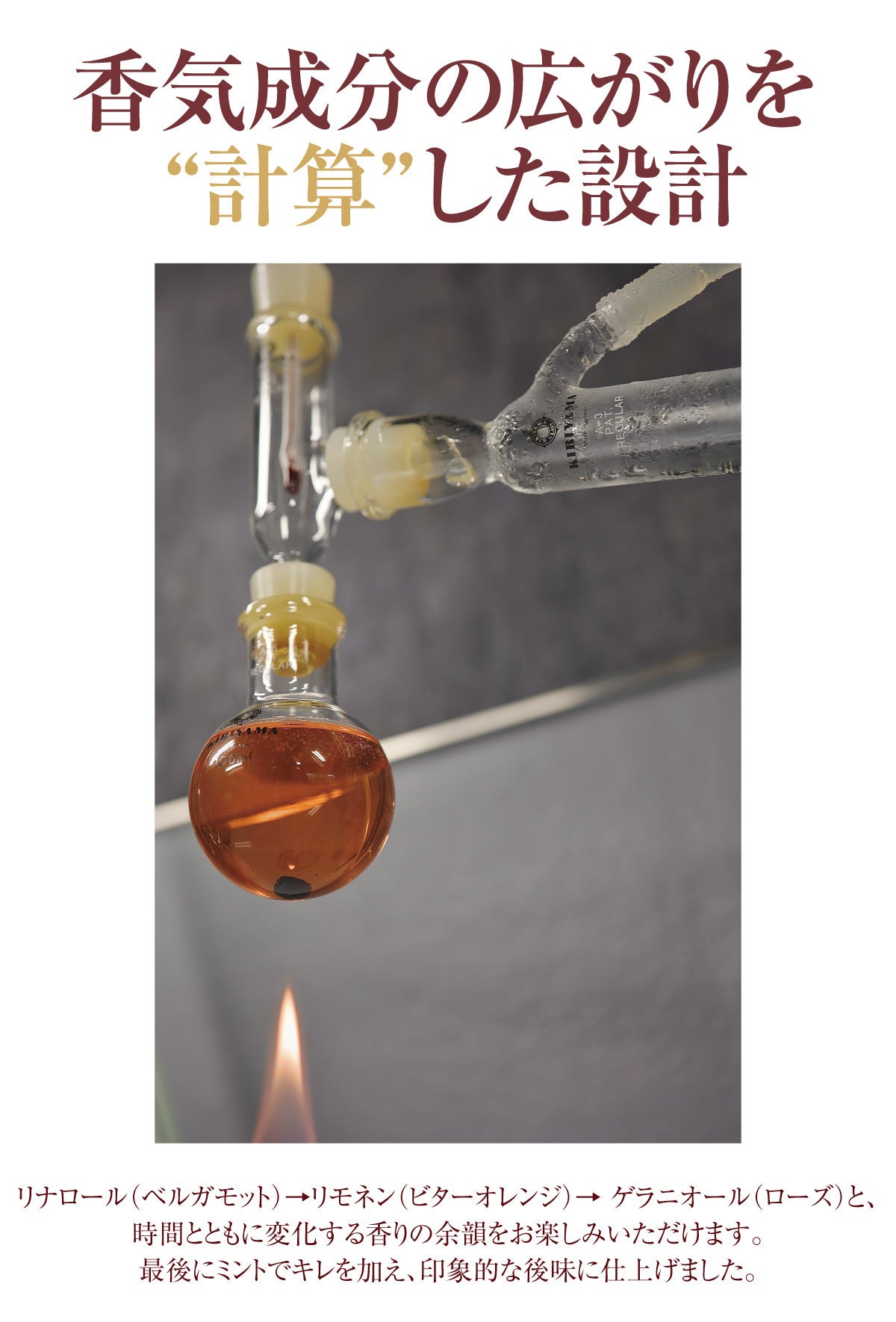 素材はすべて米由来スピリッツに丁寧に漬け込み、香料は一切使用していません。中でもミントは蒸留によって、奥行きのある香り立ちを実現。素材そのものが生み出す上質なアロマを引き出しました。