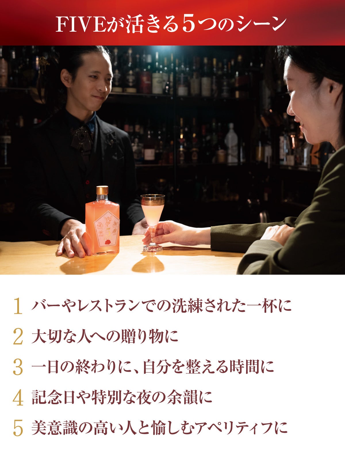 💡 カクテルのプロから美容業界まで、多彩な方々が魅了されています。FIVEは香り・味わい・ビジュアル、そのすべてで新しい体験を届けます。