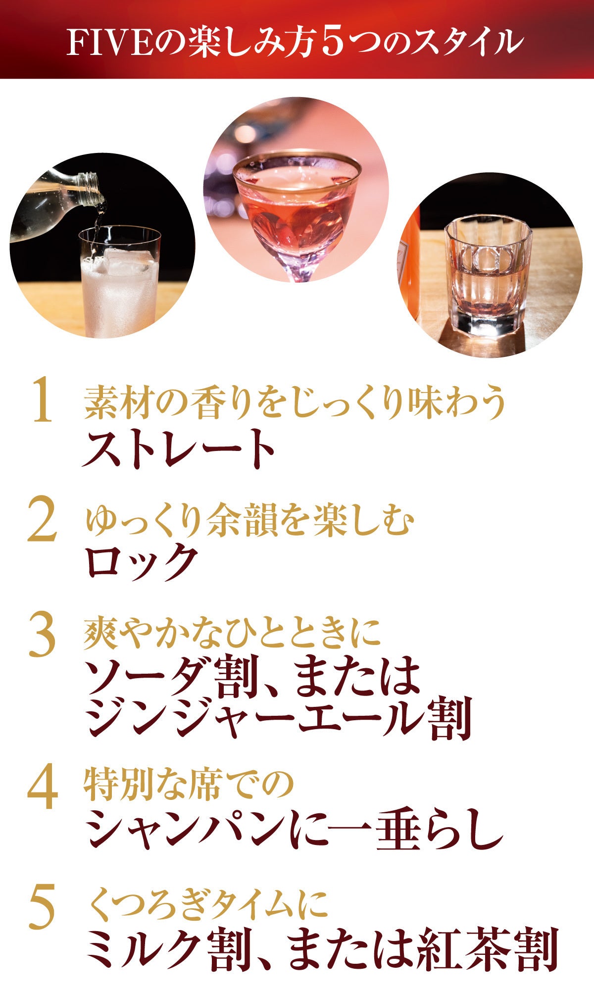『FIVE』は、そのままでも、割っても楽しめる自由なリキュール。気分やシーンに合わせて、さまざまな飲み方でお楽しみいただけます。