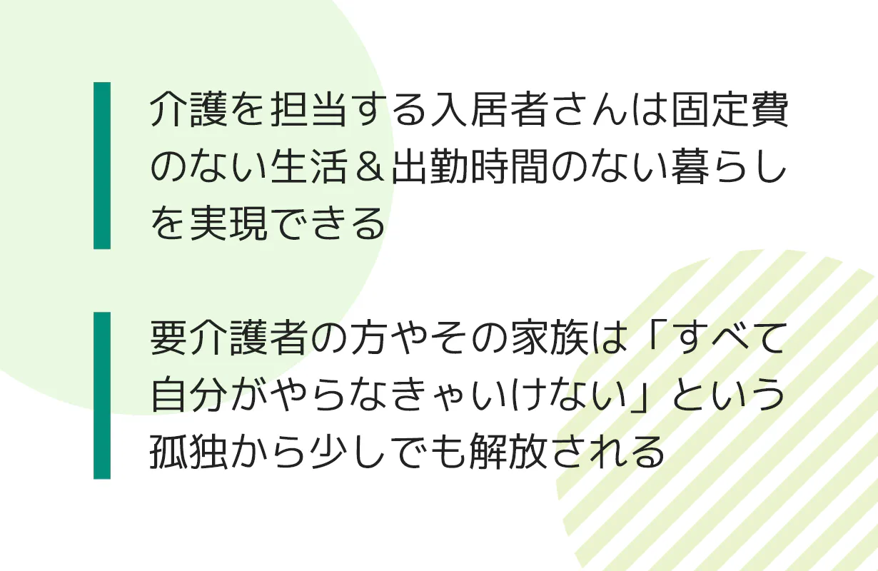 そこで、要介護者の方と生活に困っている方がシェアハウスをし、介護の給料をもらいながら無料でお家に住んでもらおう、という仕組みです。