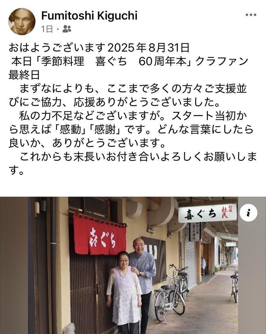 2025/09/01 15:52この度は、「【お客様と歩んだ60年】新潟の名店・居酒屋『喜ぐち』の軌跡を本に綴り継承したい」のクラウドファンディングに ご賛同・ご支援をいただき、誠にありがとうございました。皆様の温かいご支援のおかげで、ほぼ目標を達成することが出来ました。感謝、感動以外の言葉が見つかりません。心より感謝申し上げます。今、本の制作も最終段階です。お手に届くまで今しばらく、楽しみにお待ちください。これからも末永いお付き合いのほど、よろしくお願いいたします。店主・木口文敏 もっと見る