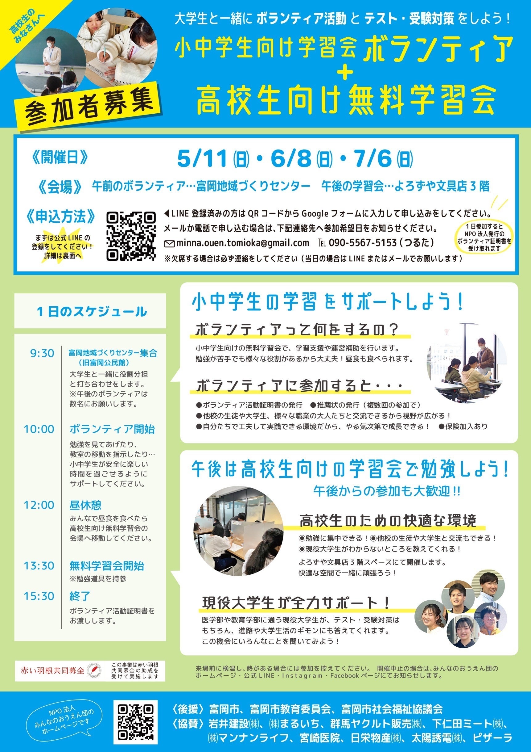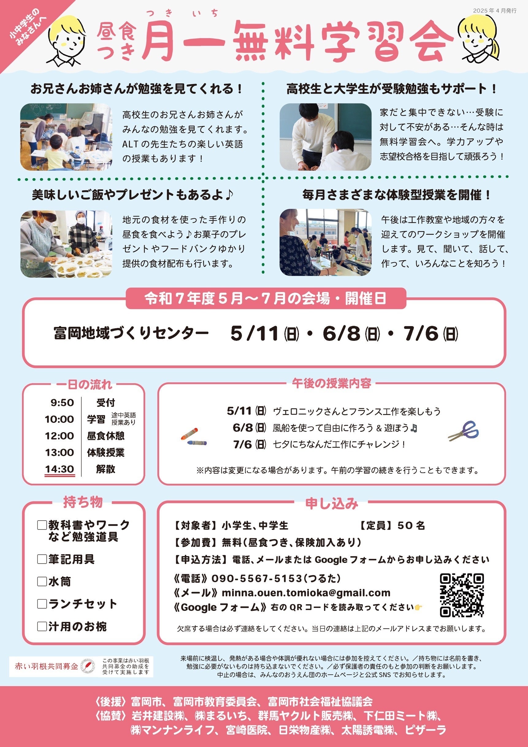 この事業の内容は高校生、大学生ボランティアが中心となり困窮家庭や環境に適応できない小中学生の学習支援をするという事業です。このような学習支援をすることで子供たちが自立できる力を身につけ自身の将来の夢について考えられることができます。また、単に学習支援だけをするのではなく昼食等の提供、富岡市国際交流員の方の英語教室の開催、さらに午後には工作教室を開いて子供達の体験格差を是正する取り組みを行っています。工作教室と同時並行で市内の文房具屋さんの3階を利用し今度は高校生の無料学習支援も行なっています。