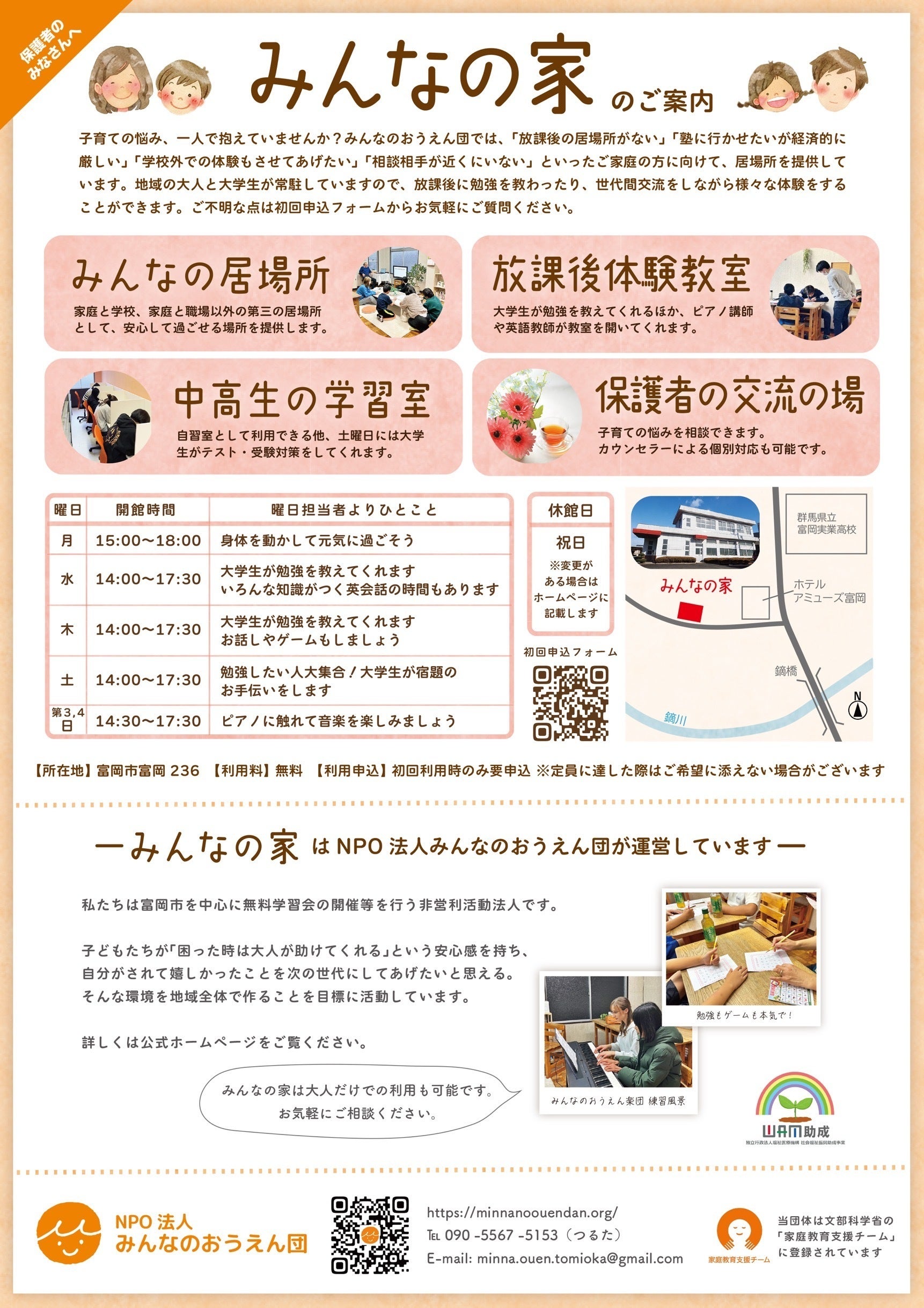 私たち「みんなのおうえん団」は、地域の活性化と子供たちの未来を支えることを使命に活動しています。群馬県富岡市を拠点に、さまざまな社会貢献活動を行ってきました。特に、子供たちの教育環境と居場所の確保に重きを置き、地域の皆さんとともに成長していくことを目指しています。私たちのチームは、教育者、社会活動家、地元の有志から成り立っており、それぞれの専門知識と情熱を持ち寄り、地域の子供たちのために日々奮闘しています。