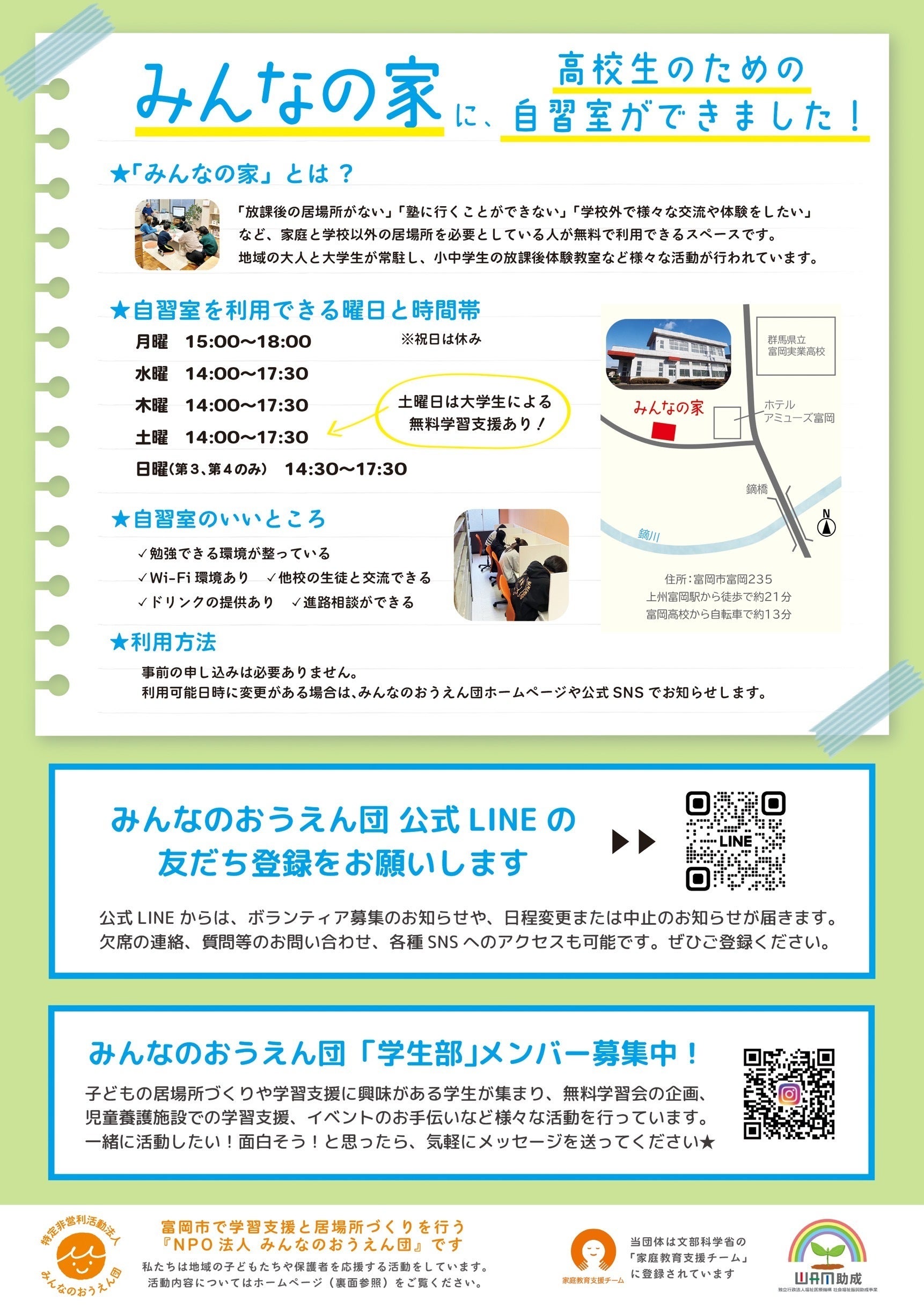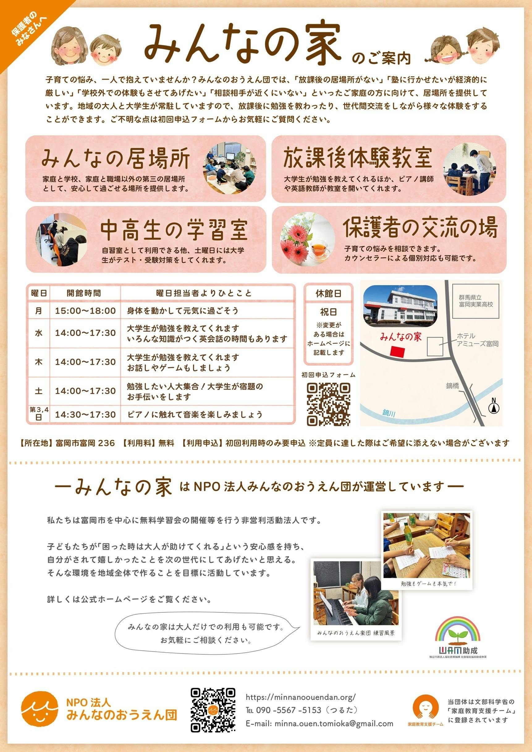 群馬県富岡市は、豊かな自然と温かい人々に恵まれた地域ですが、近年、子供たちが放課後に安心して過ごせる場所が少ないという問題に直面しています。家庭の事情や経済的な理由から、十分な教育機会を得られない子供たちも増えてきています。なので私たちみんなのおうえん団は、この状況を改善し、すべての子供たちが夢を持てる社会を実現するために、「みんなの家」を子供たちの居場所として提供し、地域全体で支える体制を構築したいと考えています。