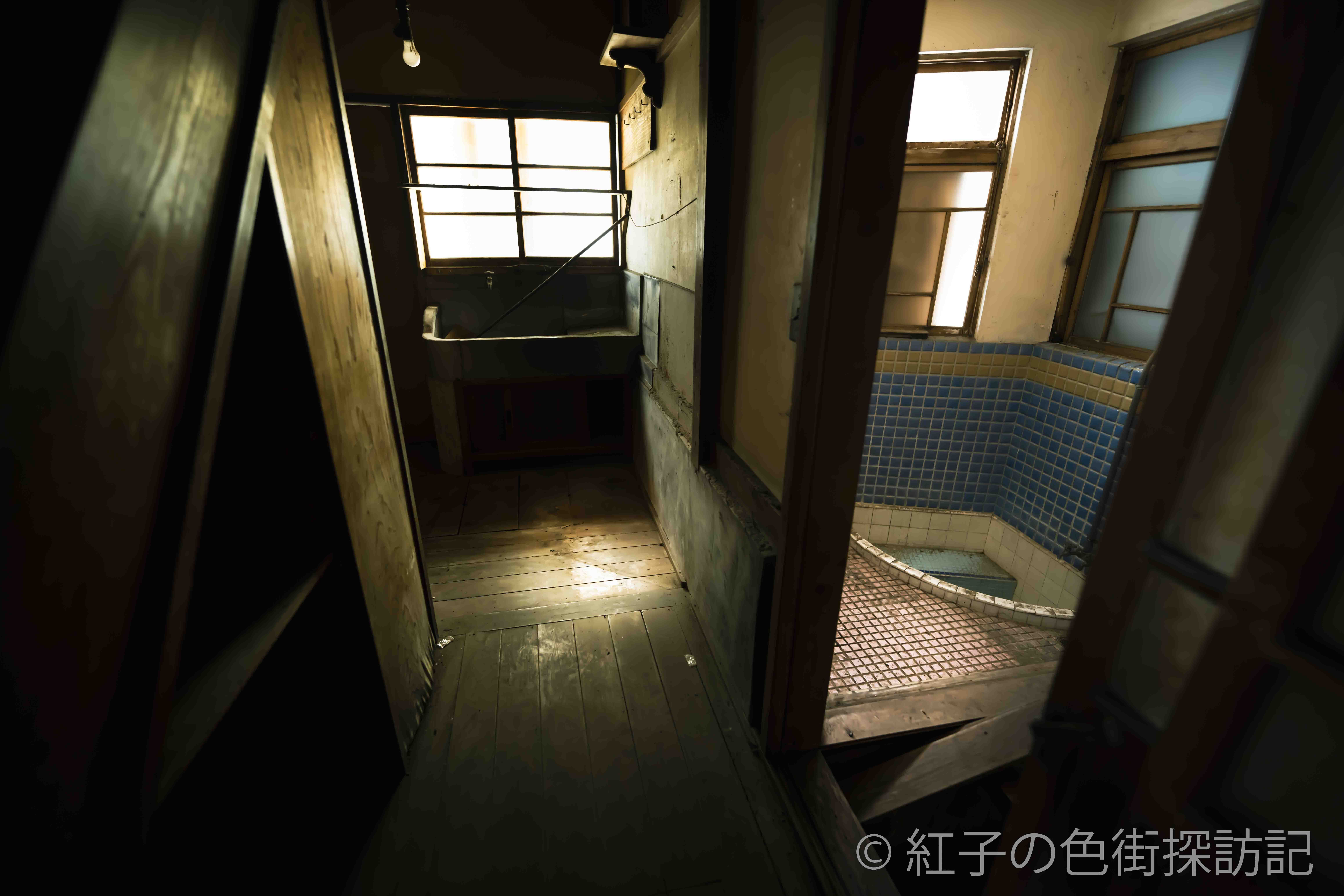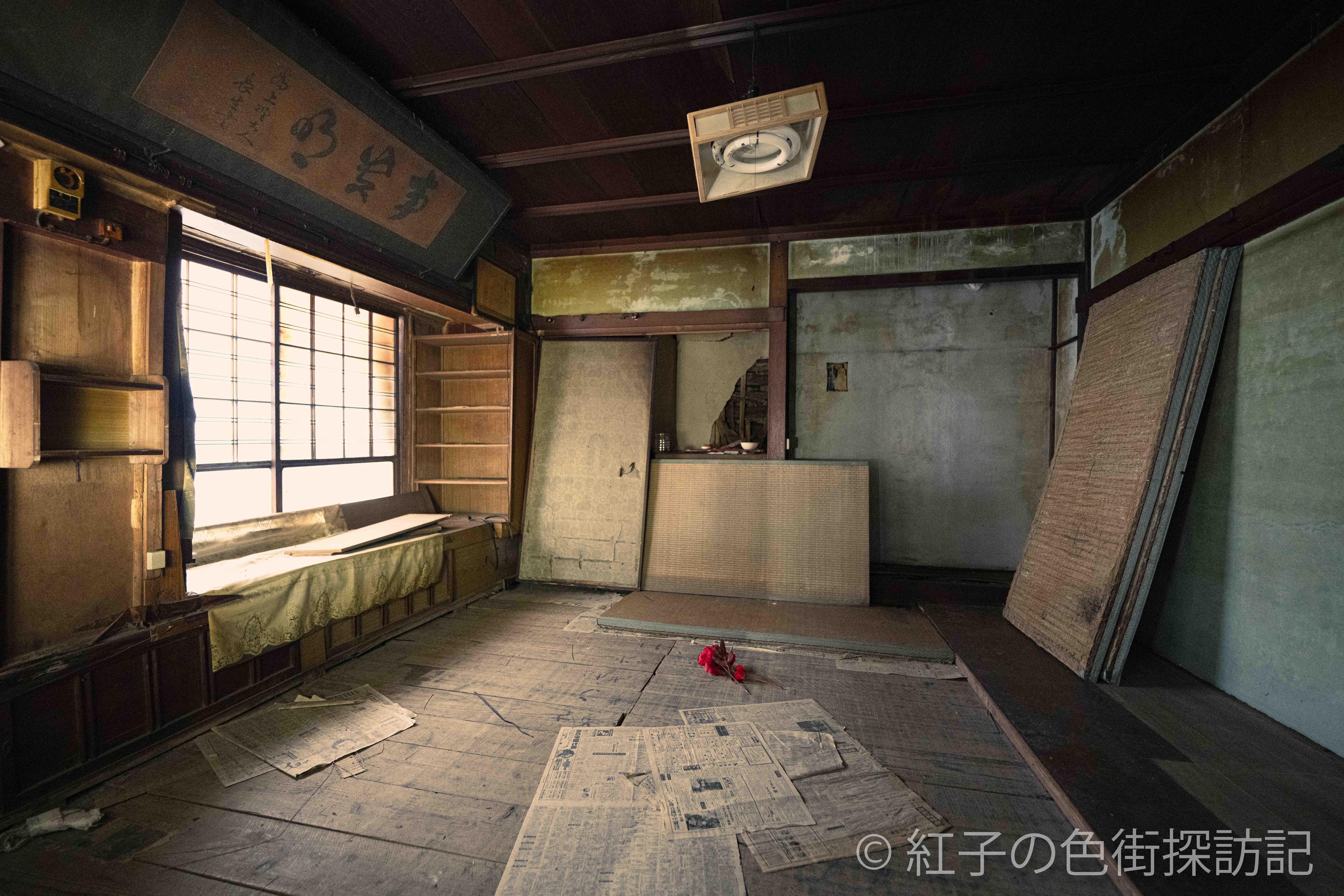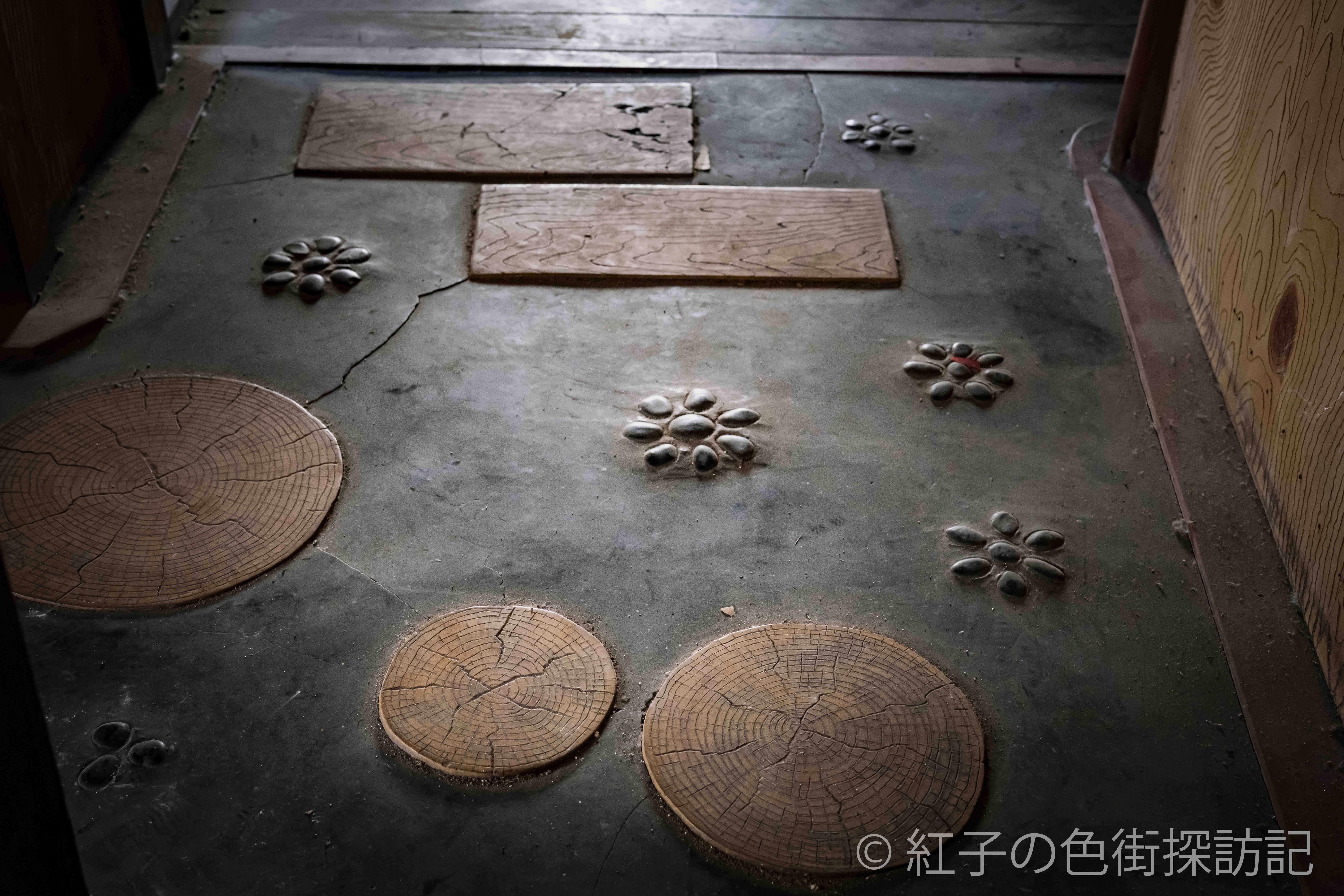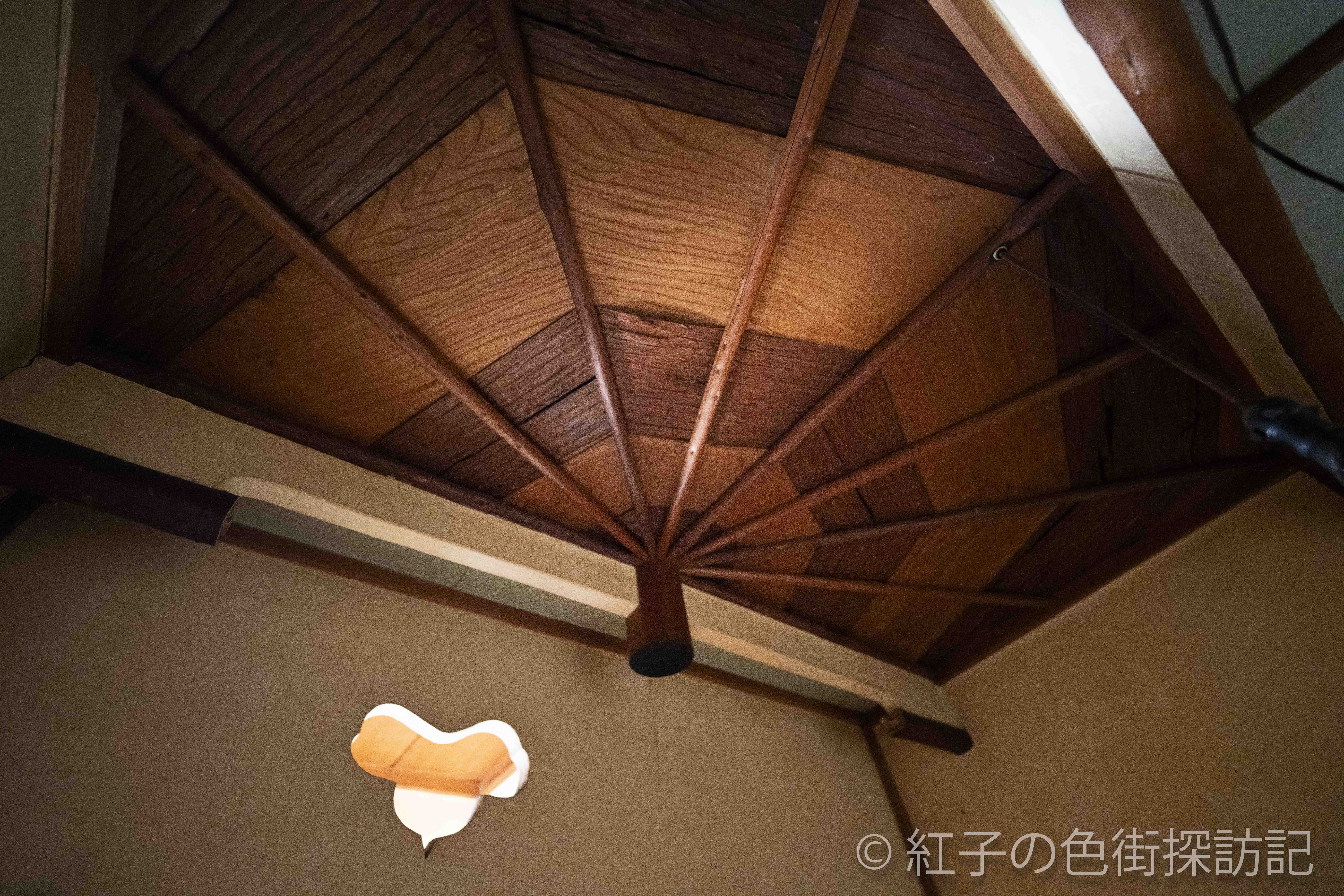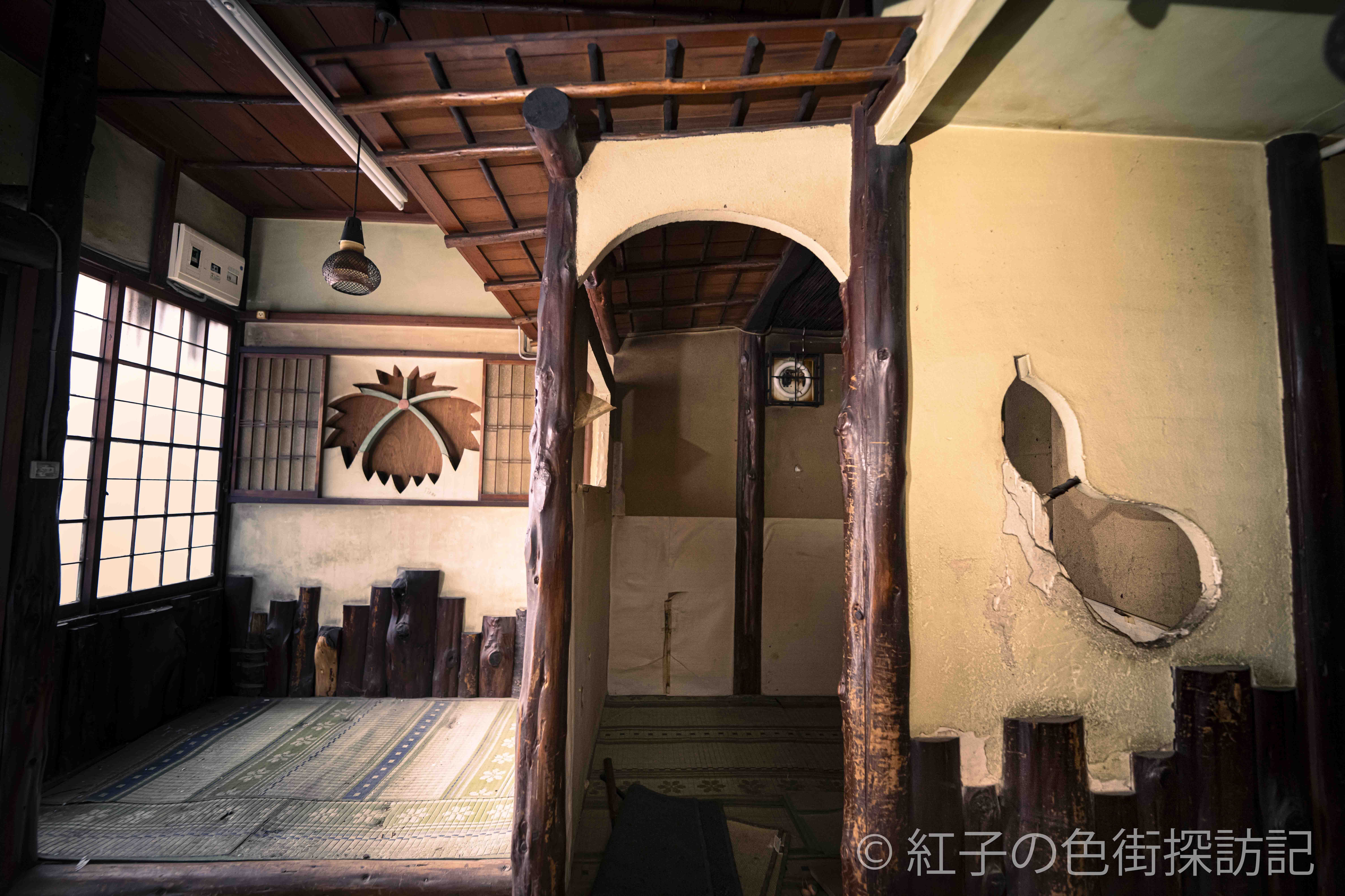 ご縁をいただいたバーコマド店主・髙須賀哲さんとの出会いから、内部を撮影させていただく機会にも恵まれました。内部には、「浴室」と書かれた文字、瓢箪や蔦の葉などの遊廓建築に見られる意匠、そして「あやめ」「さくら」と名付けられた艶やかな部屋の札が残っていました。そこには、性産業という特殊な背景から長く人々の記憶の奥に押しやられてきた、昭和のリアルな歴史が静かに息づいていたのです。