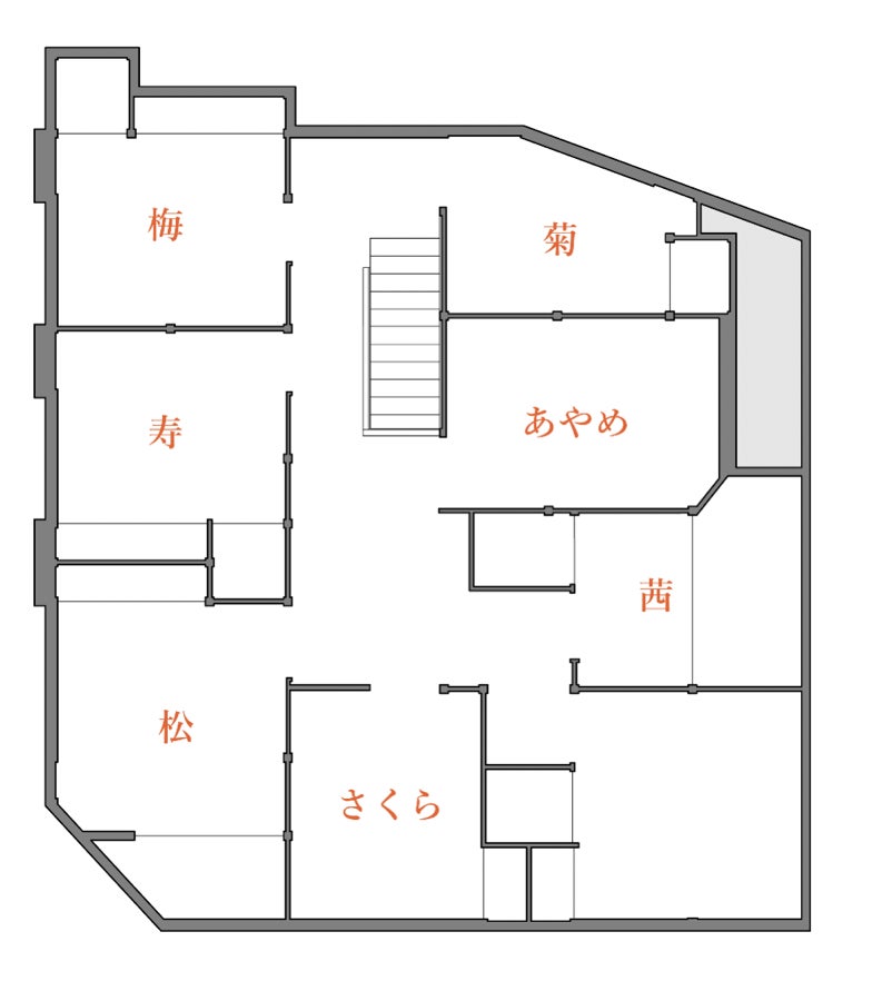 2階には計8つの小部屋があります。それぞれ、「梅」「蔦」「あやめ」のように名前が付けられており、それにちなんだ意匠が部屋の入り口にあしらわれています。部屋の広さや作りはそれぞれ異なりますが、天井や壁、床には数寄屋建築にも用いられてきた技法が使われています。