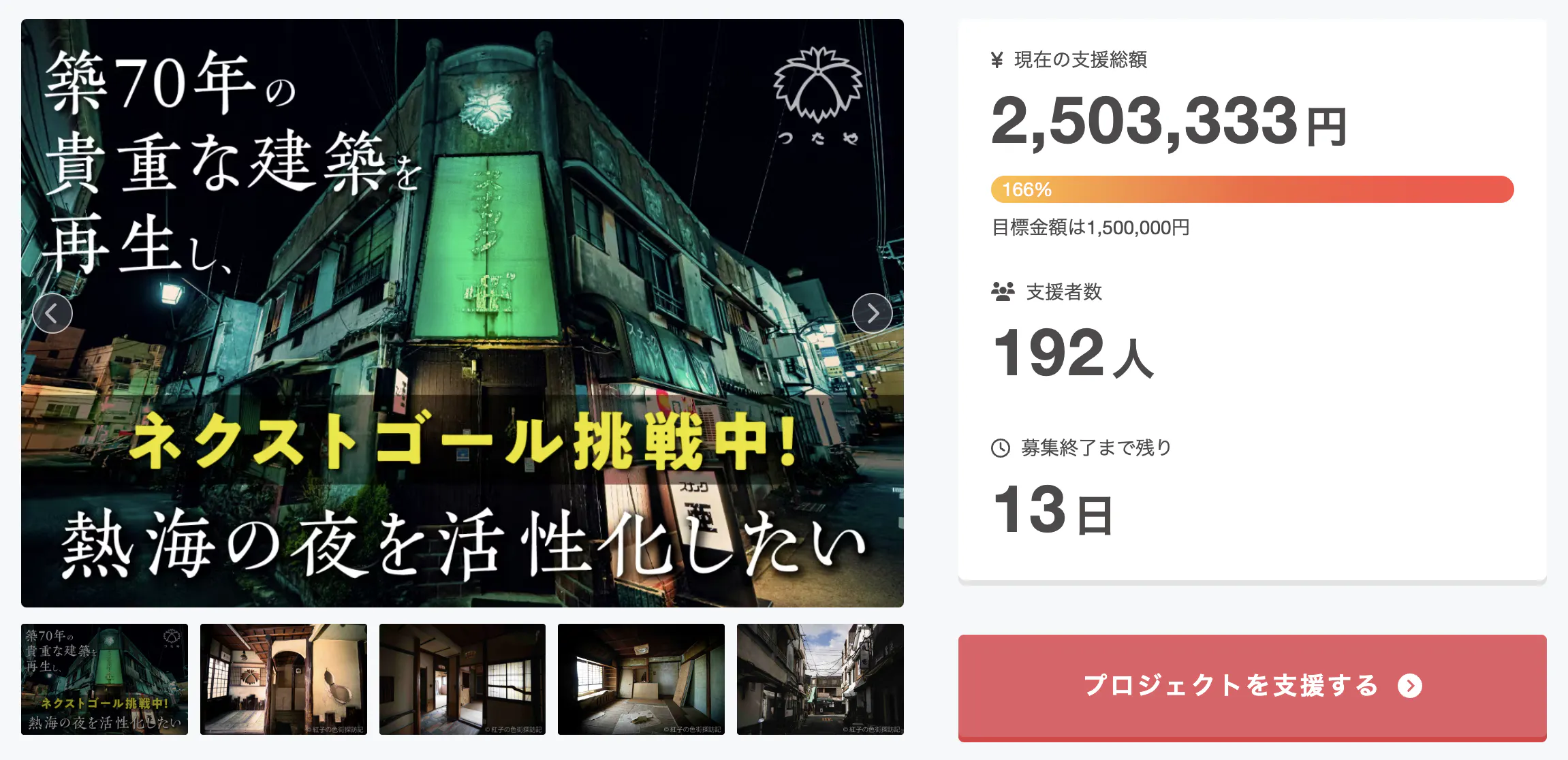 ネクストゴールを達成できましたが、まだプロジェクト終了まで2週間近い時間が残されています。すでに十分なご支援をいただいておりますので、次のゴールは設定せず、追加でいただいたご支援は、建物の維持やまちに還元できる活動に活用させていただきたく思います。