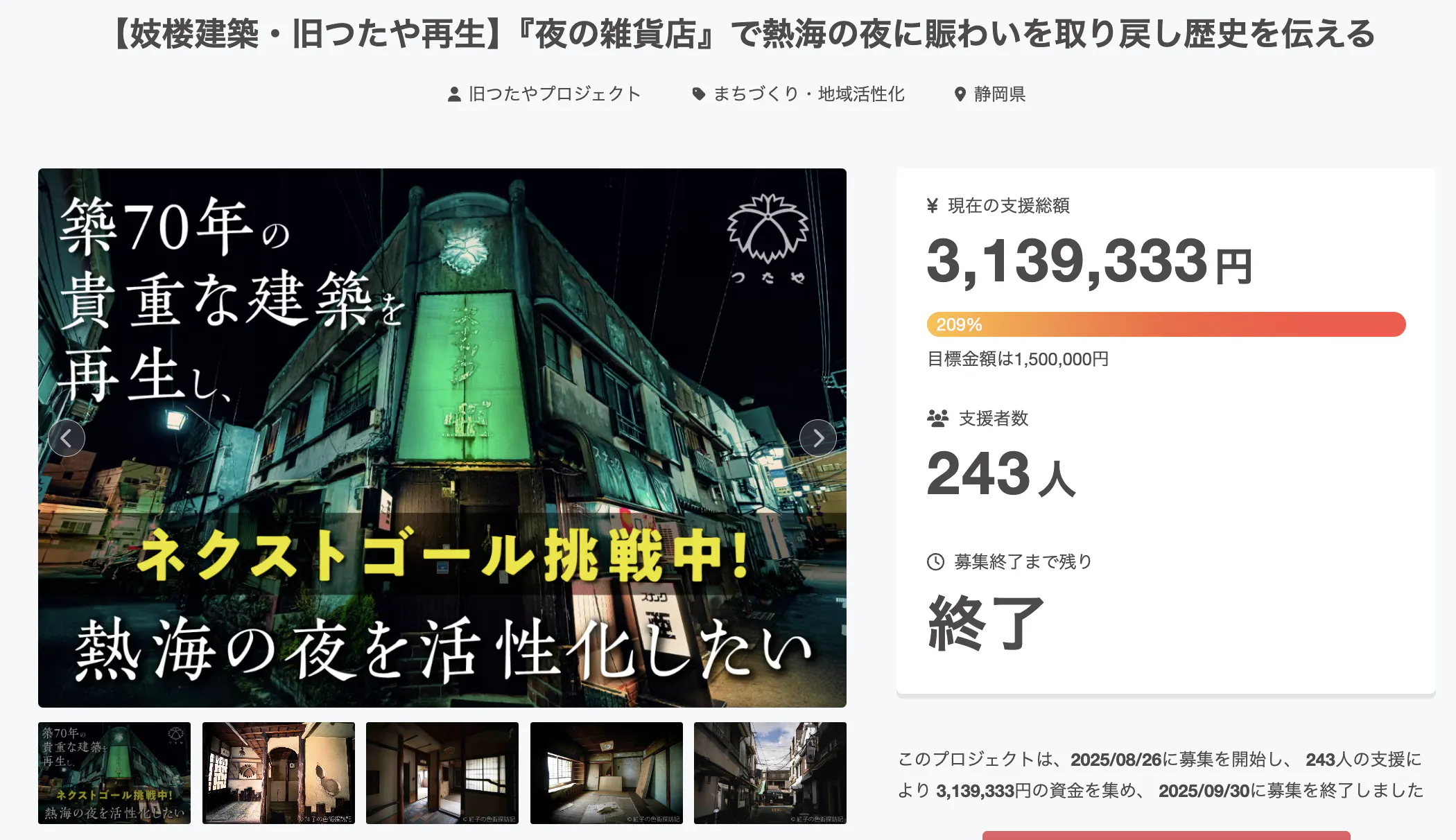 この度は、クラウドファンディング「【妓楼建築・旧つたや再生】『夜の雑貨店』で熱海の夜に賑わいを取り戻し歴史を伝える」にご支援をいただき誠にありがとうございました。