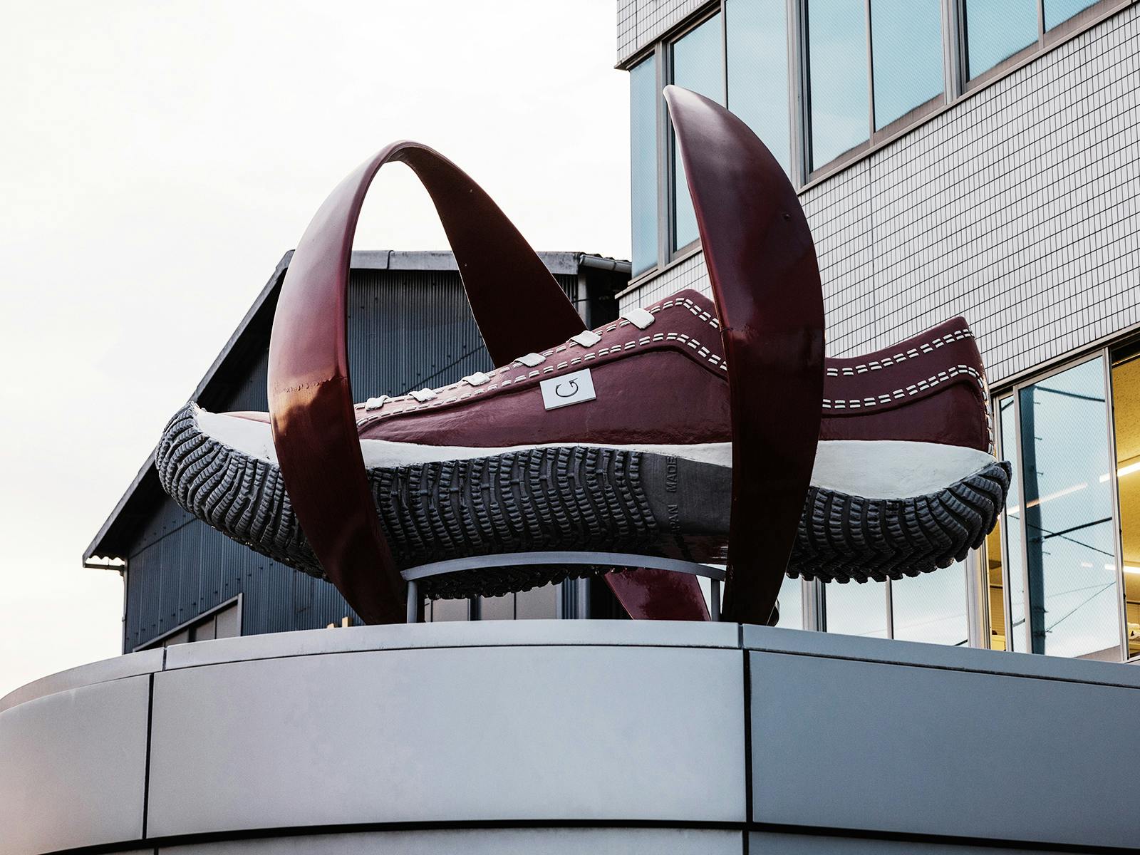 この巻き上げソールを用いたSPINGLEのスニーカーのモニュメントが広島県府中市の本社・入り口には建てられています。