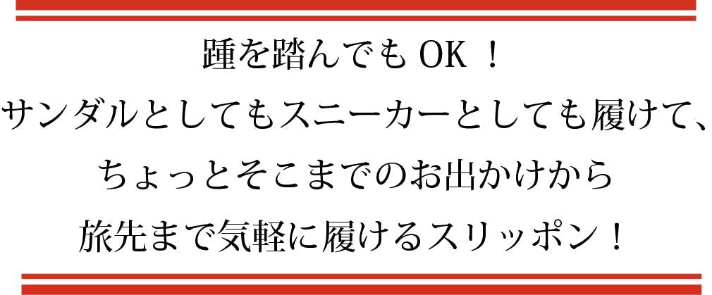踵を掛けて、旅行などの遠出でも楽に履けるスリッポンです。