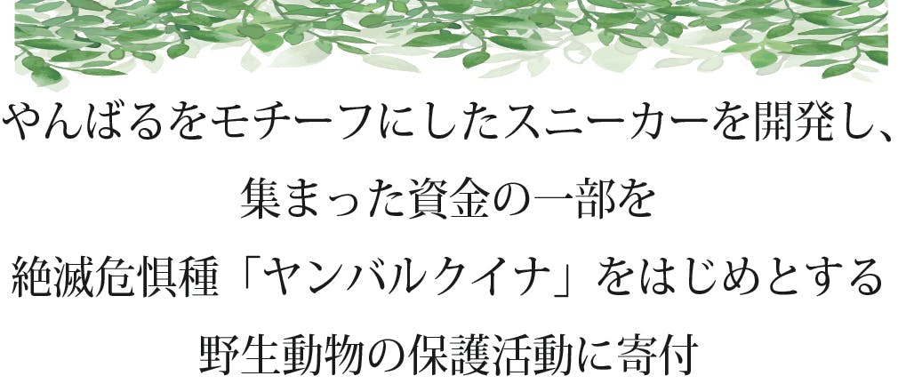 この度、世界自然遺産 沖縄島北部『やんばる』をモチーフに開発するスニーカーをリターン品としてご用意させていただき、集まった資金の一部をやんばるの野生動物保護活動への支援金として『NPO法人どうぶつたちの病院 沖縄』様に寄付させていただくべく、本プロジェクトを立ち上げさせていただきました。