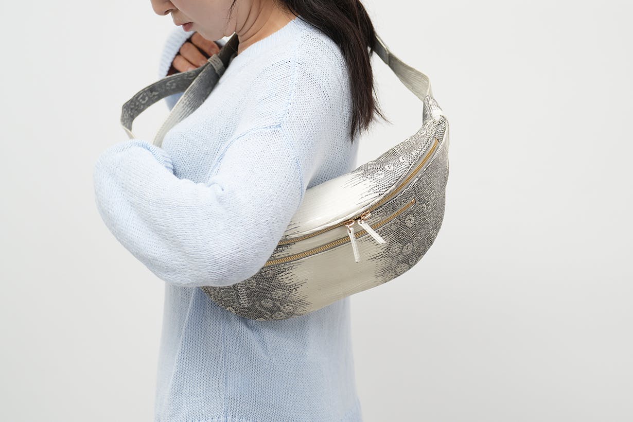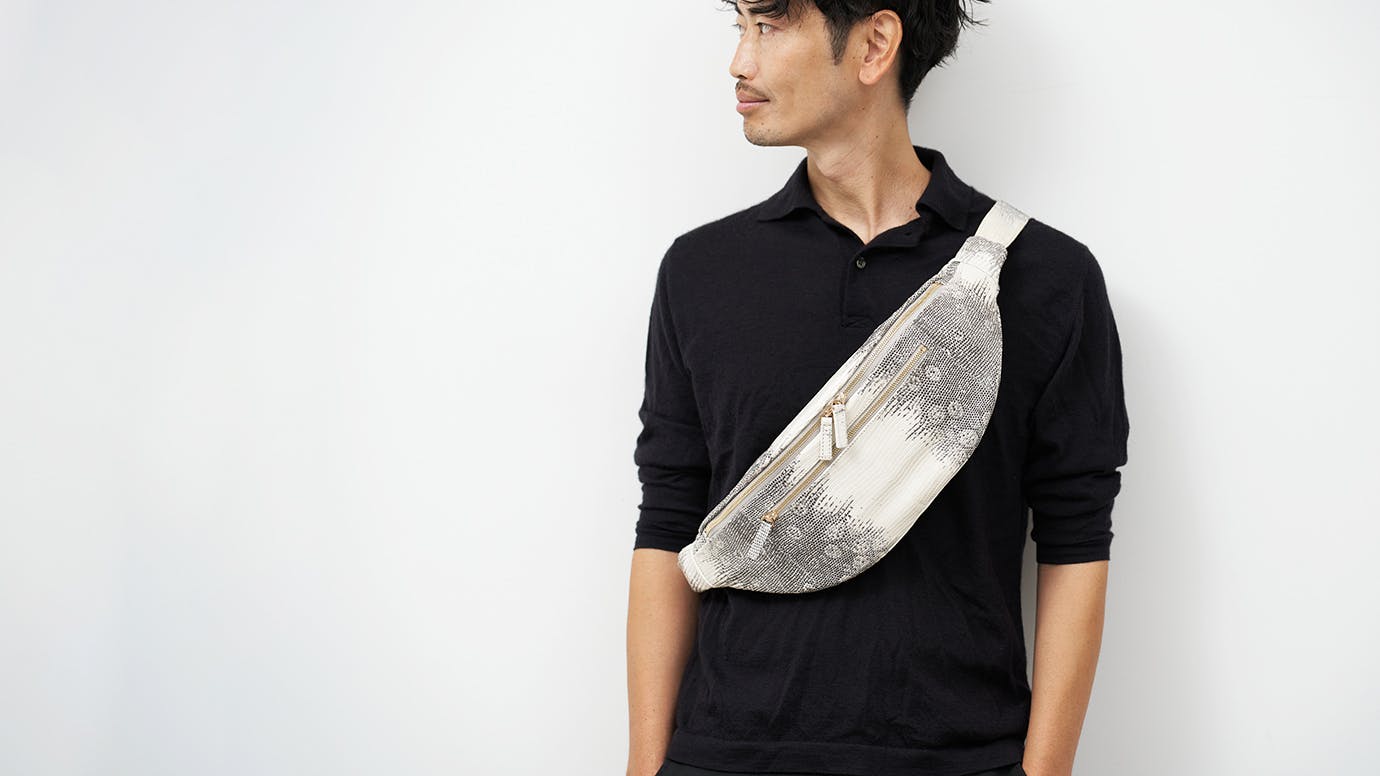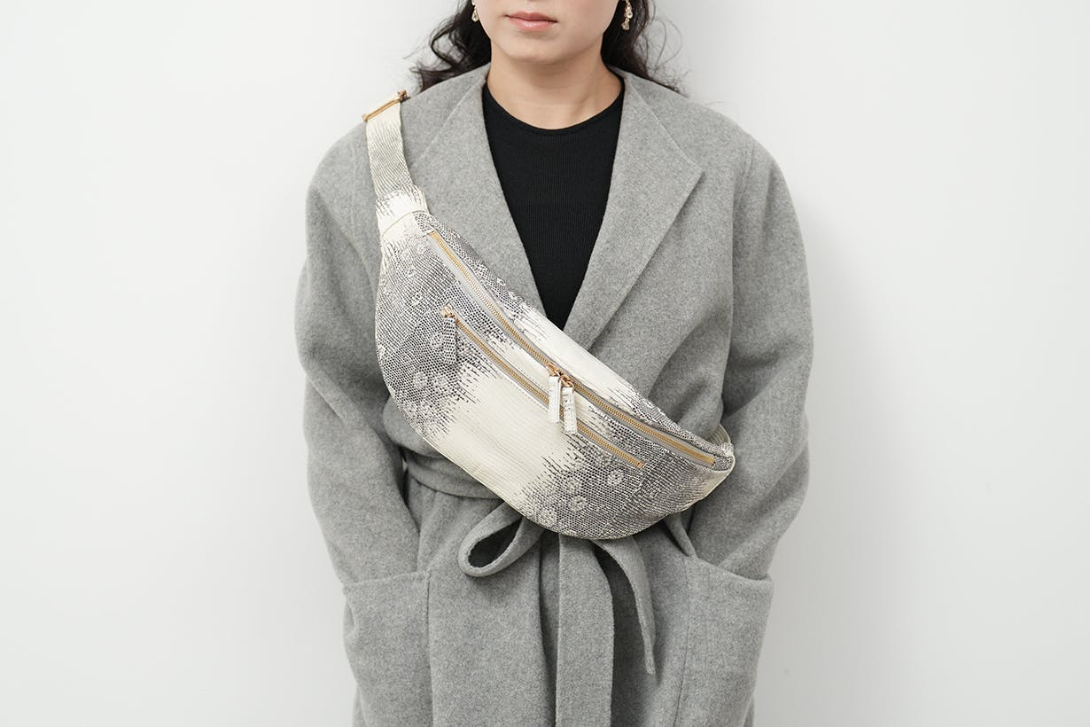 ヒマラヤリザードの素材を活かしたボディバッグ。