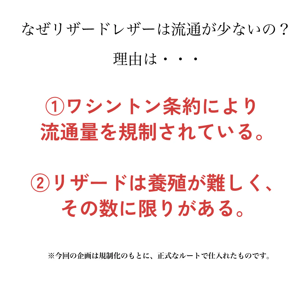 クロコダイルは養殖が可能で一定量の流通量が可能ですが、リザードは違います。