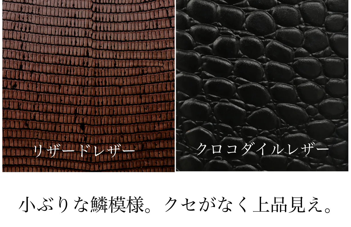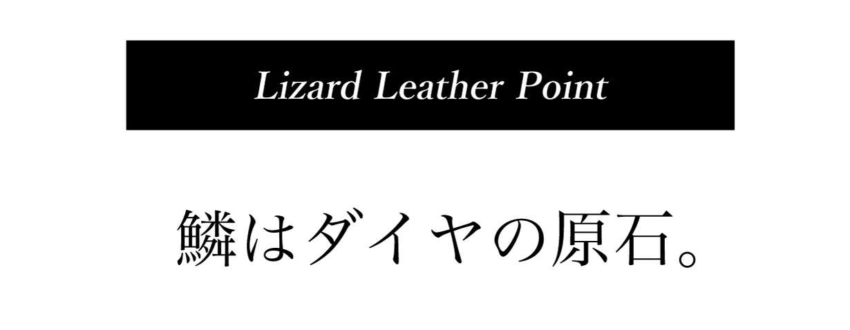主張は少ないが、クセがない鱗模様が上品に見えるリザードレザー。小粒の引き締まった模様がクロコダイルレザーとは違う表情を与えてくれます。